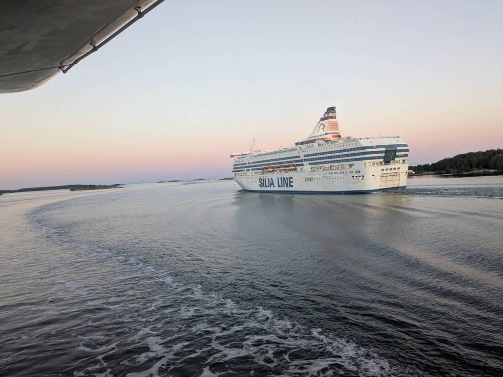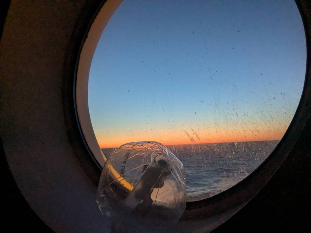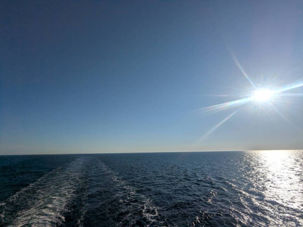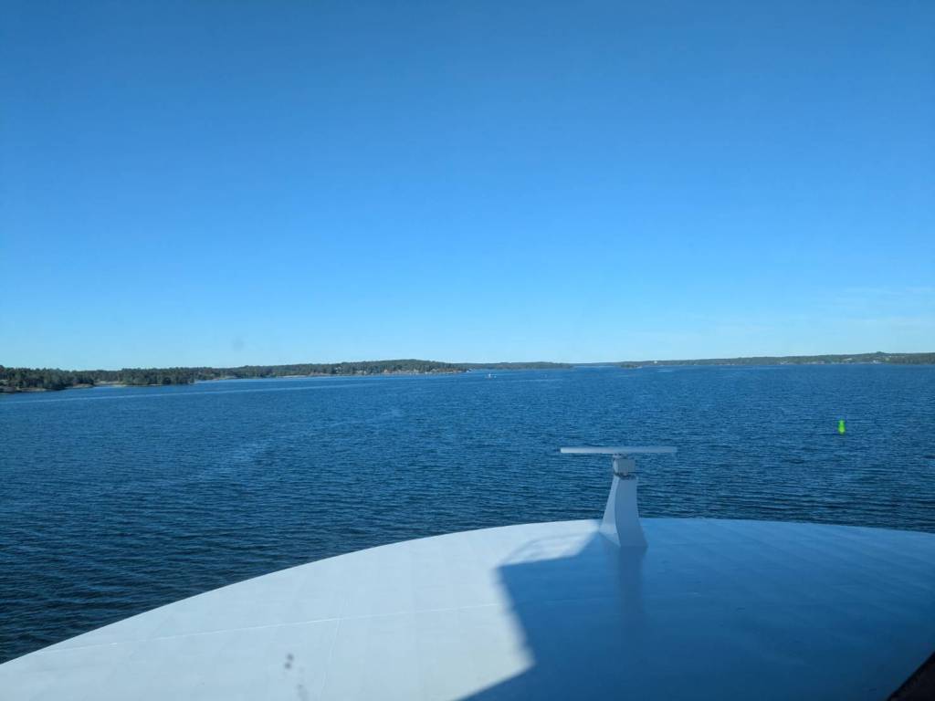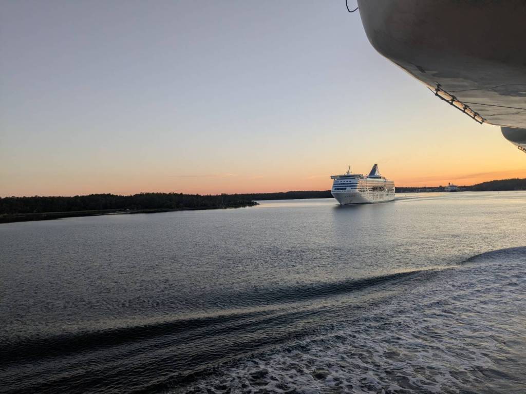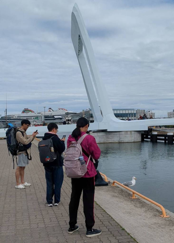果然,連接兩岸的「聖靈人行橋」慢慢地在轉動,這時候刺耳的警示聲還在持續響著,那麼吵的聲音難道居民不會發瘋嗎?尤其現在才早上6點而已…「聖靈人行橋」要旋轉的警示音就像防空警報一般刺耳發出。 大約2分鐘後,人行橋已與河道平行,看見一艘白色遊艇通過,而人行橋這時也保持原樣,不急得擺回橫的吧!(須等半小時才會轉正)