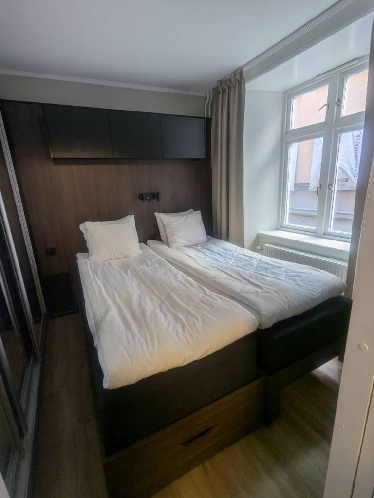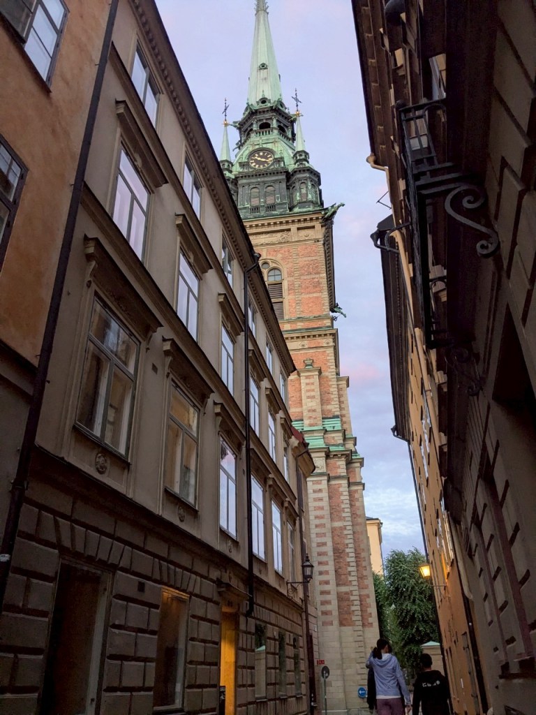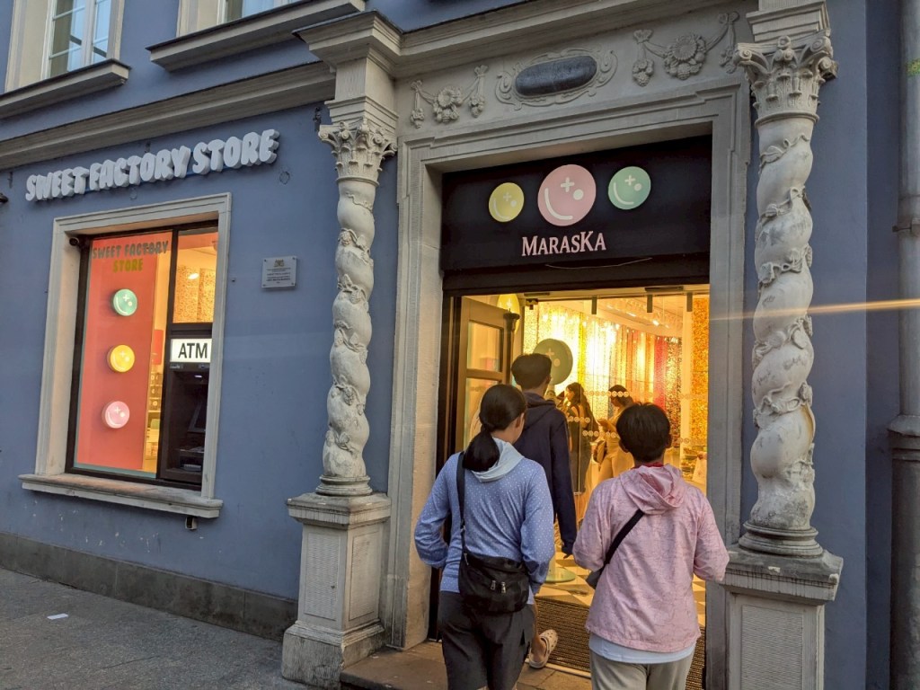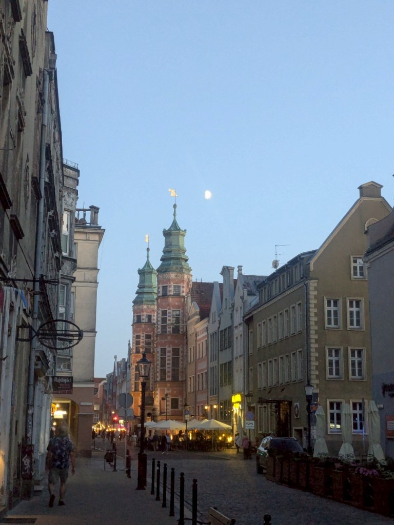 早上7點,從捷徑的「瓦尼薩街」(Ławnicza)走回旅館,左邊是位於古蹟建築的酒店–Crystal Amber & Silver。從這個角度看到「舊市政廳」與「聖母瑪莉亞大教堂」的尖塔。