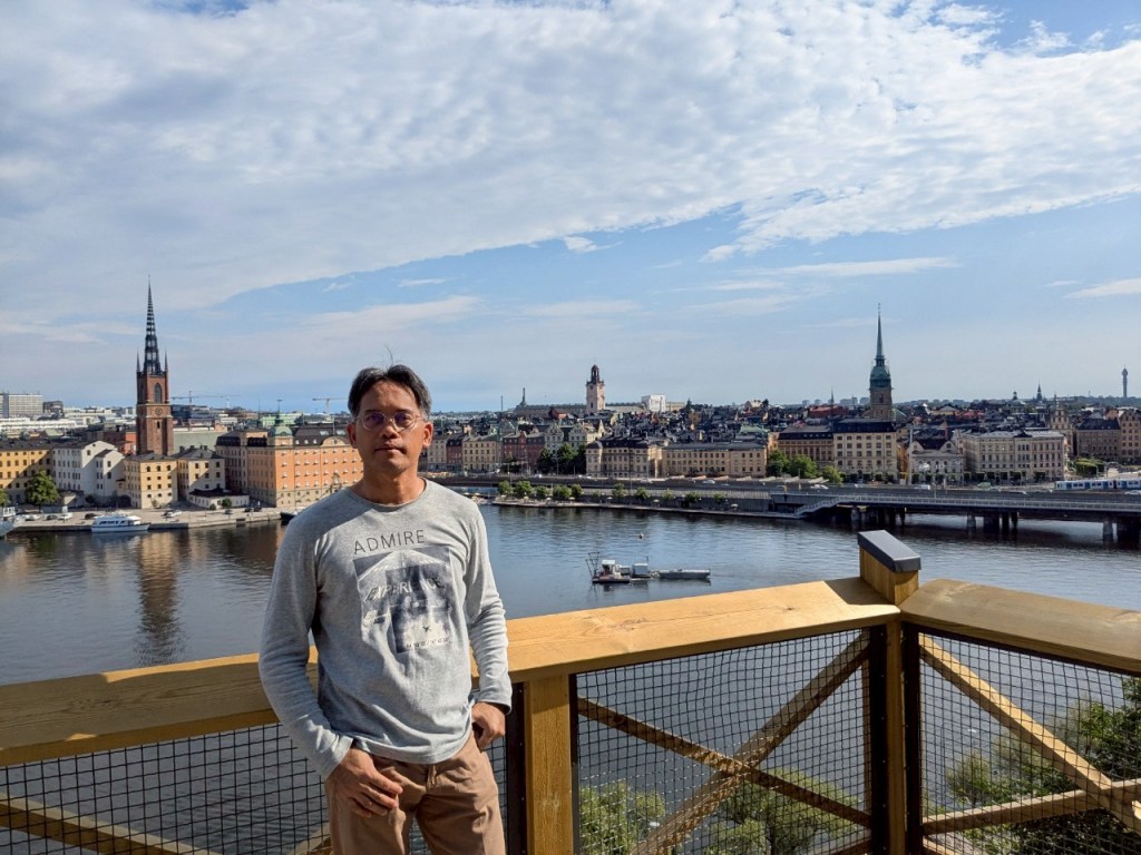 從「斯塔吉夫納塔」走到西北側的「聖靈人行橋」(Kładka Grzegorza)約莫5分鐘,陽光灑在平靜的「莫特瓦河」上,波光粼粼如碎金般閃爍,又完美倒映著兩岸建築的剪影,讓整個視界呈現出一種寧靜而夢幻的對稱美。