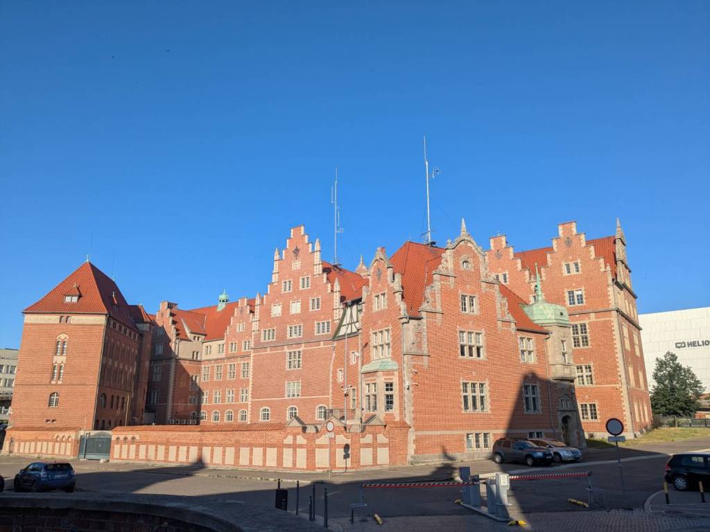 「歐克波瓦街」(Okopowa)上亮眼的「新文藝復興」設計風格建築群–為1902至1905年間前「德意志帝國」所建的「警察主席團」所在地,主樓內部設有警察局各部門的辦公、拘留室空間,並透過走廊與局長官邸相連,整體布局環繞著一座中央庭院,庭院東側以高牆圍繞,現在是「格但斯克内部安全局」(情報局)辦公大樓。