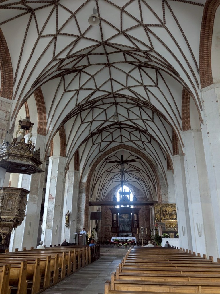 展現14-15世紀建築藝術的「聖母瑪莉亞大教堂」是「歐洲」最大的磚造教堂之一,擁有「哥德」式紅磚塔樓建築特色,多座尖塔高聳林立,最高的青綠色尖頂高達78公尺,層層疊疊出戲劇性的天際線,又有尖拱窗、飛扶壁交織出繁複而壯麗的立面,在清晨的微光中勾勒出戲劇性的天際線,美得令人屏息。