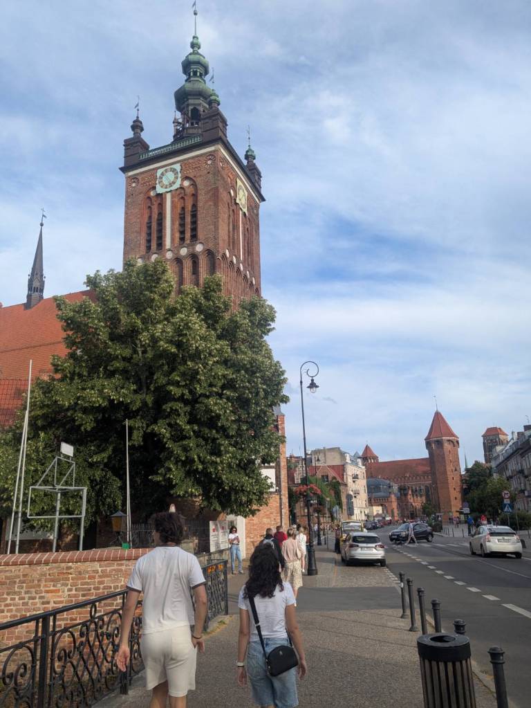 矗立的紅磚高塔就是「市政廳」的鐘樓,塔身線條挺拔,綠色銅質尖頂在藍天下格外醒目,清晰可見的鐘面象徵著城市的時間與秩序。而眼前的石板路筆直向前延伸,清晨人潮尚未湧現的時刻,街道顯得格外空曠;兩側色調柔和的彩色立面建築,色彩從米白、淡綠到磚紅,立面裝飾細膩,山牆線條起伏富有節奏,在澄澈藍天的襯托下,這條負有歷史重量的街區展現出「格但斯克」老城典型的優雅與從容。