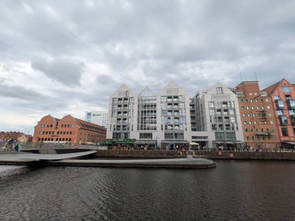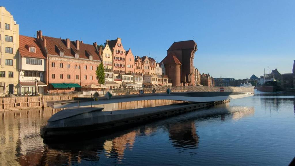 從橋上可遠眺格但斯克老城與糧倉島的風景,黃昏時光或夕陽餘暉灑落在河面與建築之間,是散步與拍照的好位置。