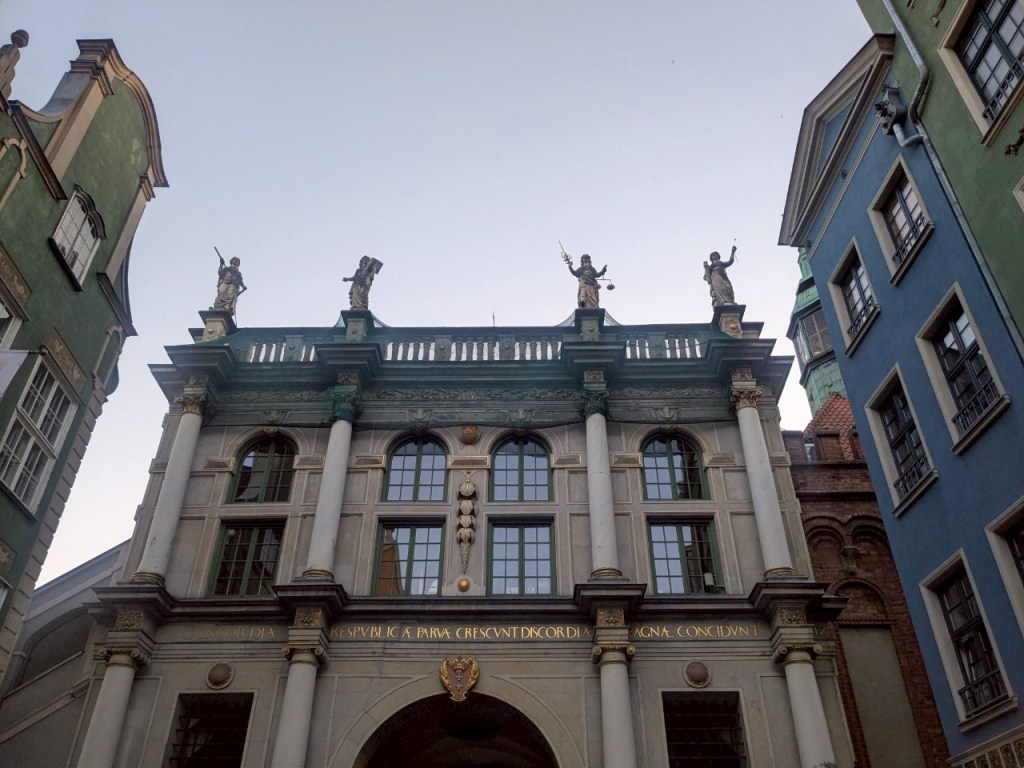 經過有「4球冰淇淋」雕刻的「金門」(Golden Gate),雖然城體不是金色的,但城樓上方的8尊雕像可是鍍金的,因此被稱為「金門」。東側(「杜拉加街」這一邊)半圓拱型大門的正上方盾徽是「格但斯克」城的象徵,上方的銘文是「願您城中平安,願您宮中興旺」之意;而城樓上方的雕像則代表理想的公民美德:由右而左為「和諧」(Concordia)、「正義」(Iustitia)、「虔誠」(Pietas)及「審慎」(Prudentia)。