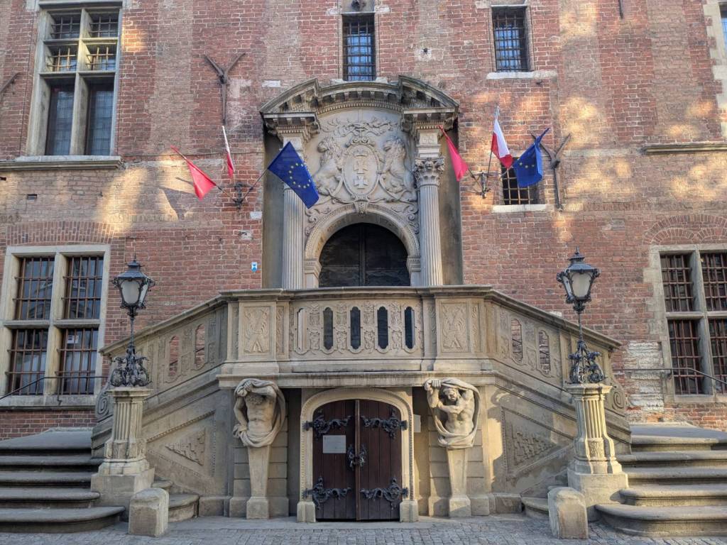 「舊市政廳」的正門,大門的上方是「格但斯克」的城市徽章。
