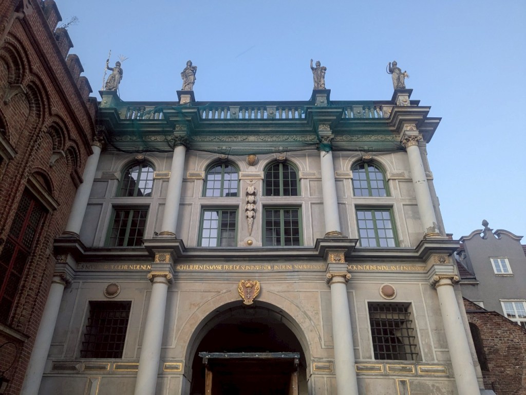 - 正面裝飾有波蘭王國徽章及格但斯克城市盾徽,入口上方可見拉丁文銘文,展現當時的人文精神與城市榮耀。