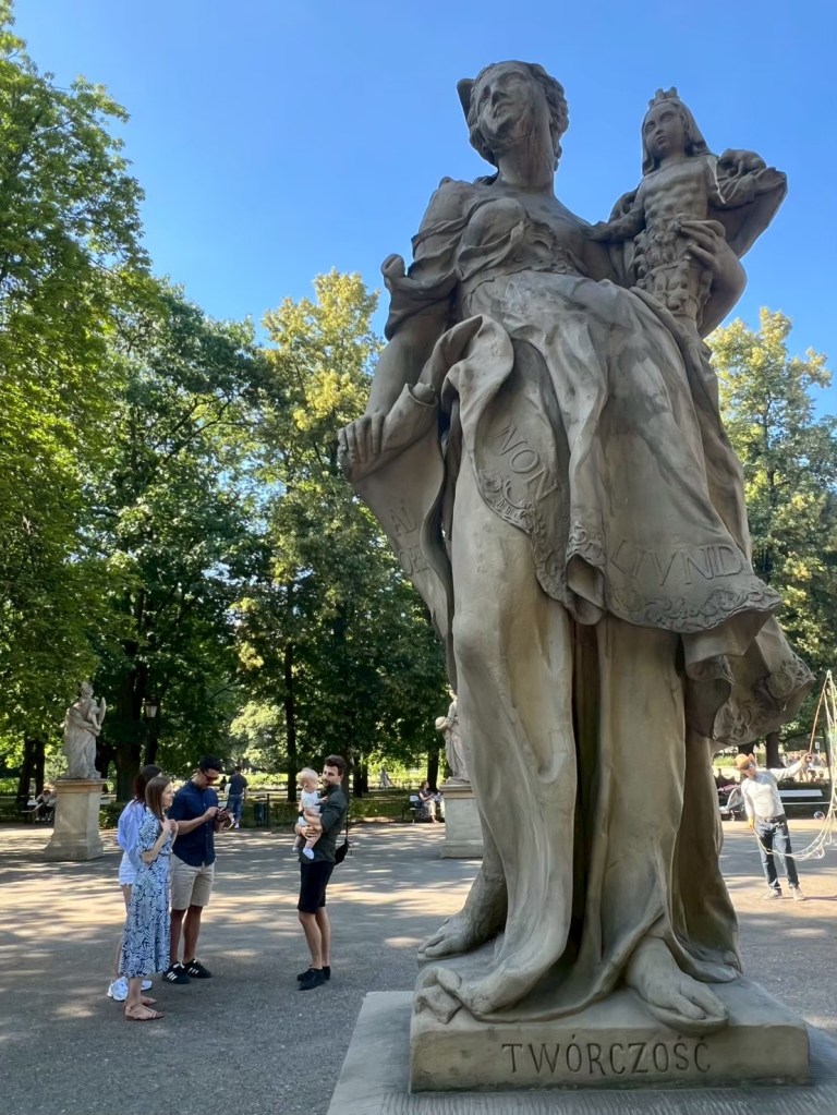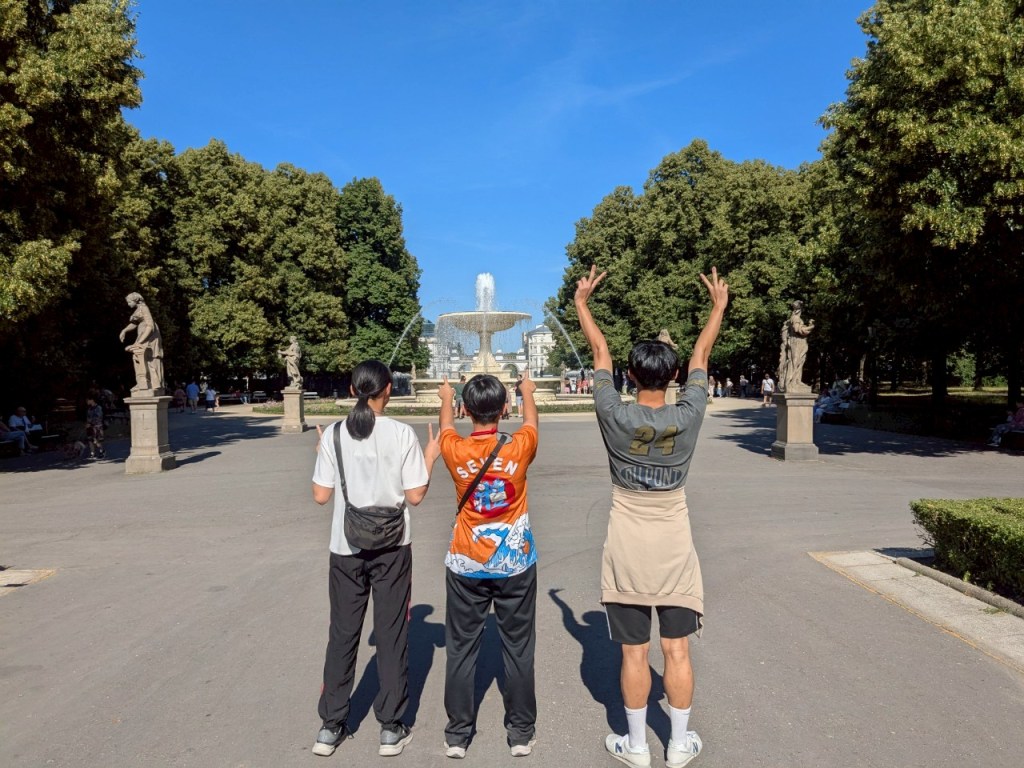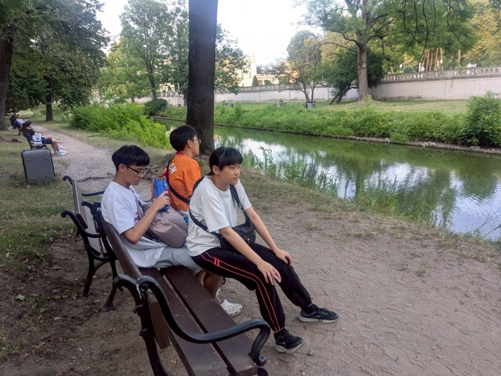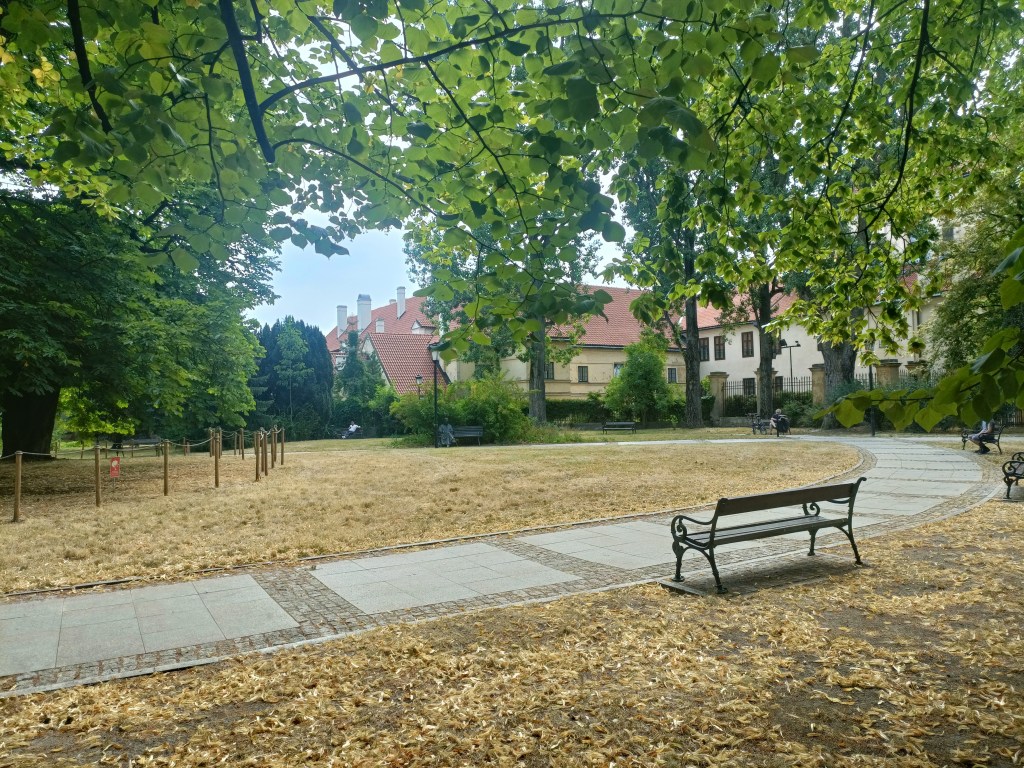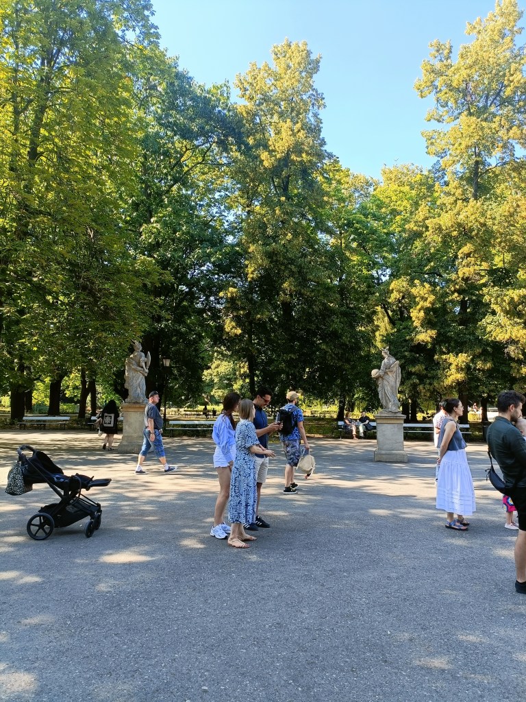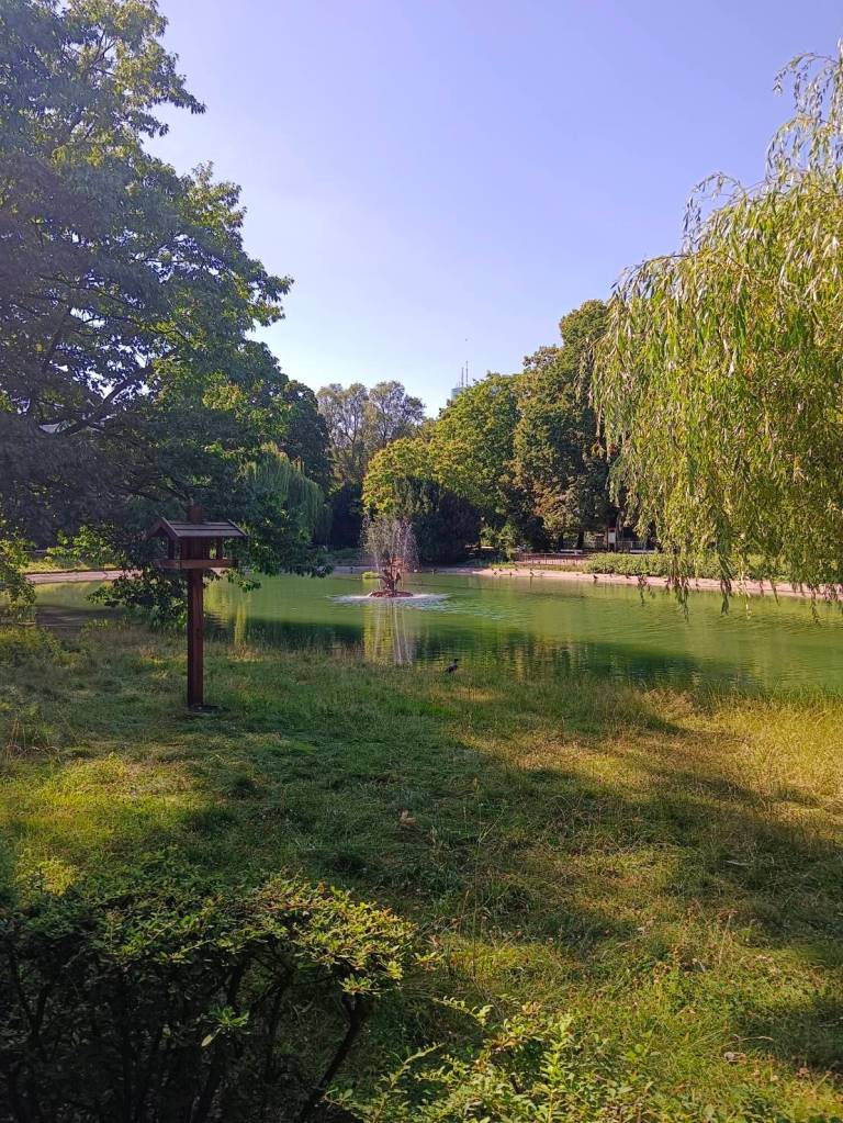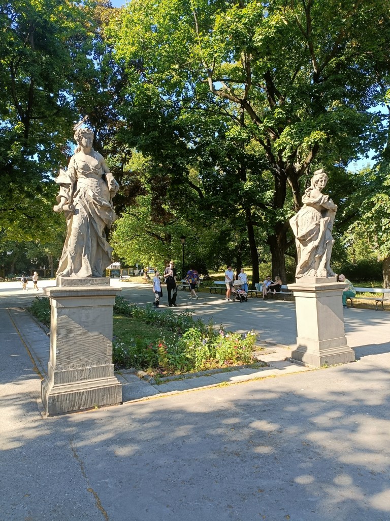 下山之後右轉,沒有走在來程的路上,而是沿著「維爾尼亞河」踏進城市公園——「伯納丁花園」(Bernardine Garden),這裡夏季樹林茂密,花壇與小徑都維護得很好,還有幾座可愛的雕塑。