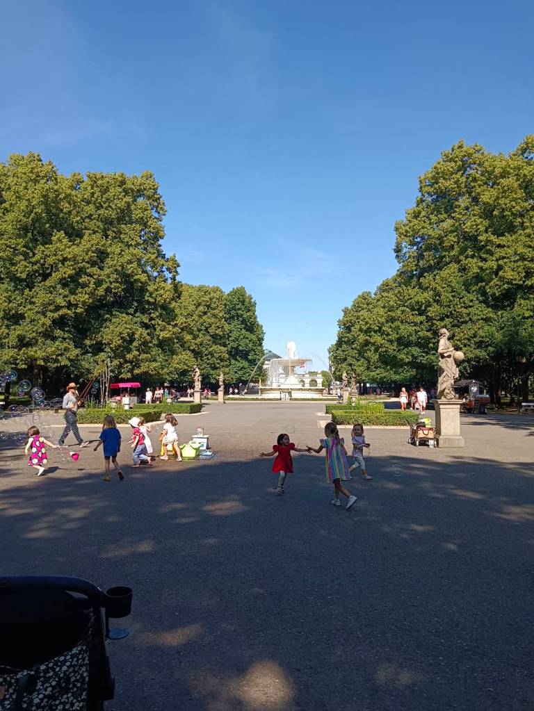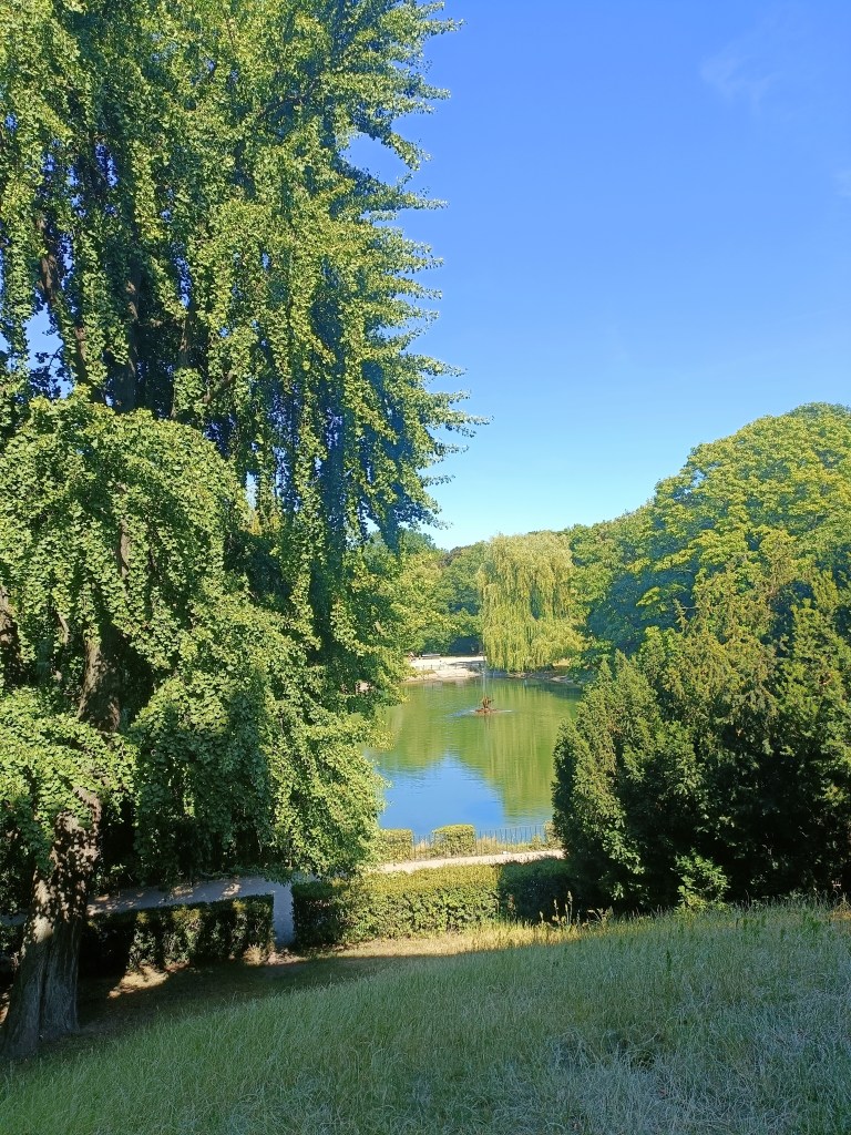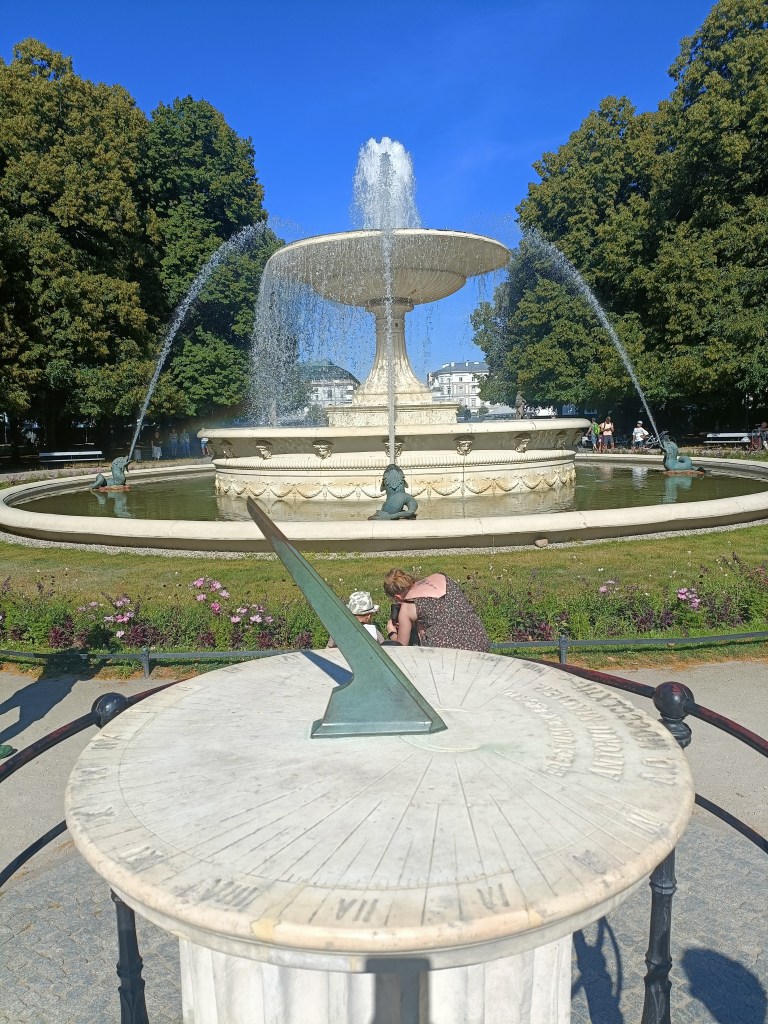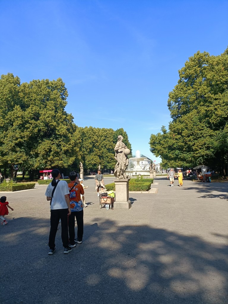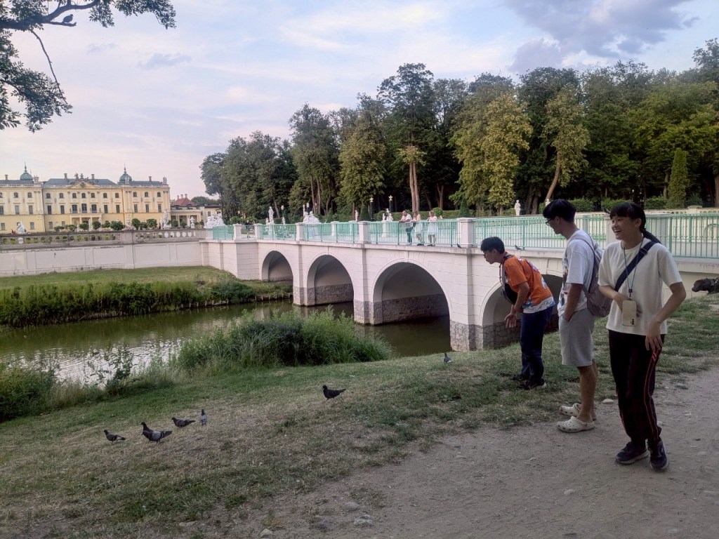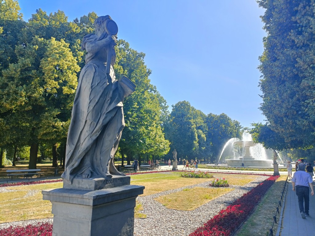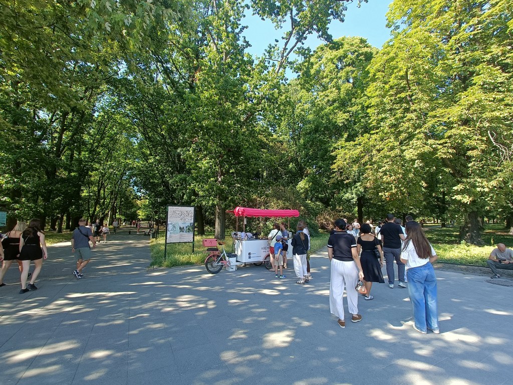 下山之後右轉,沒有走在來程的路上,而是沿著「維爾尼亞河」踏進城市公園——「伯納丁花園」(Bernardine Garden),這裡夏季樹林茂密,花壇與小徑都維護得很好,還有幾座可愛的雕塑。