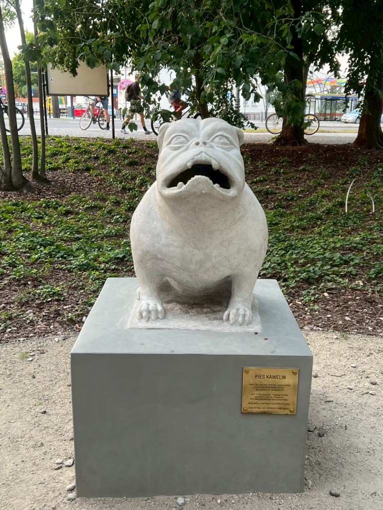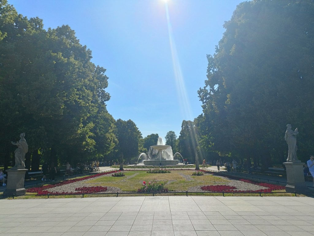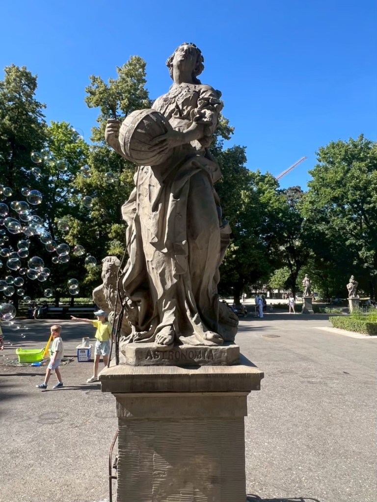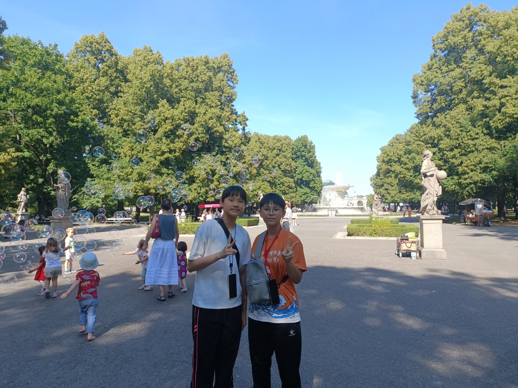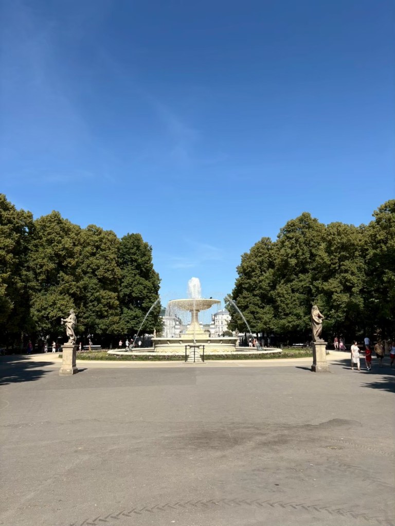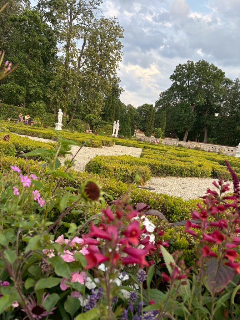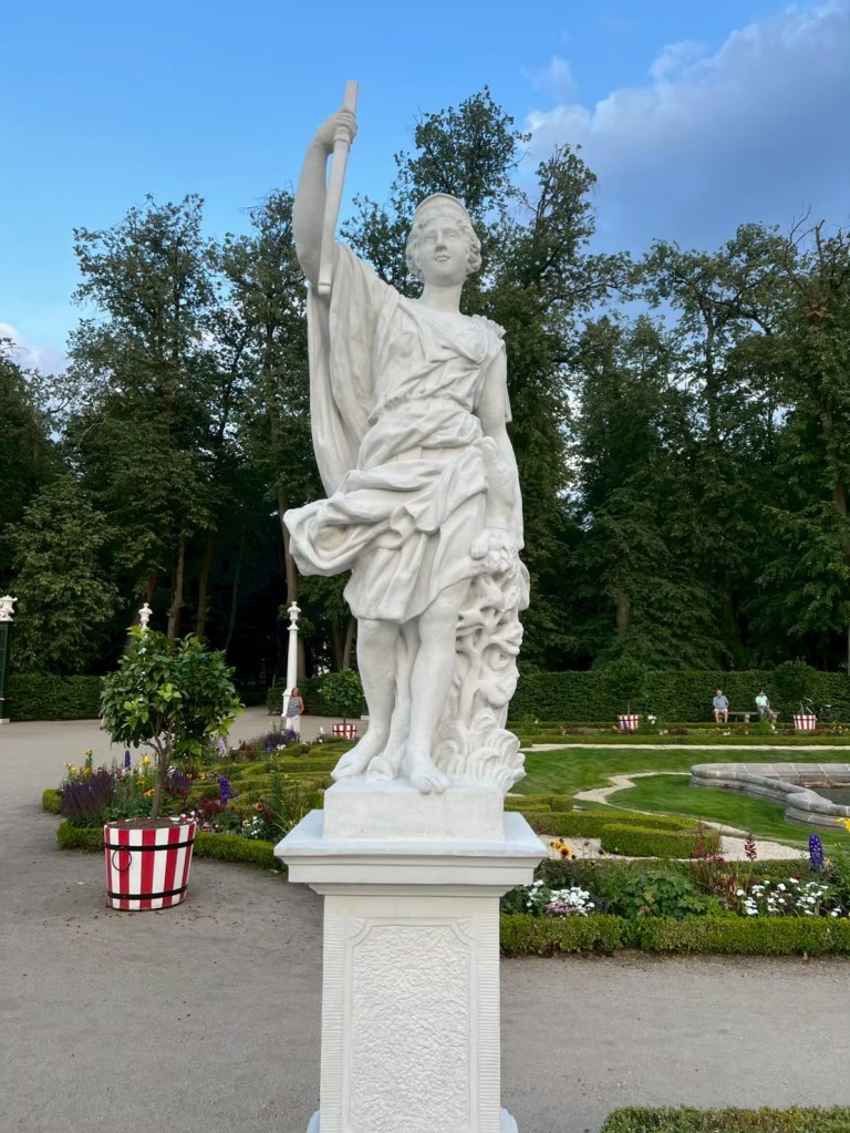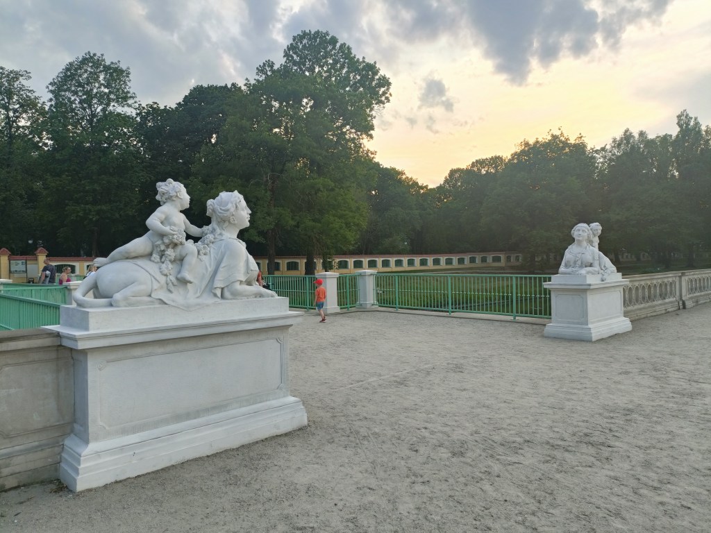 下山之後右轉,沒有走在來程的路上,而是沿著「維爾尼亞河」踏進城市公園——「伯納丁花園」(Bernardine Garden),這裡夏季樹林茂密,花壇與小徑都維護得很好,還有幾座可愛的雕塑。