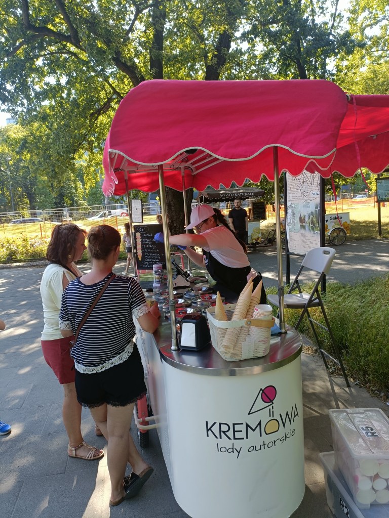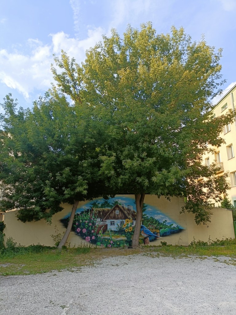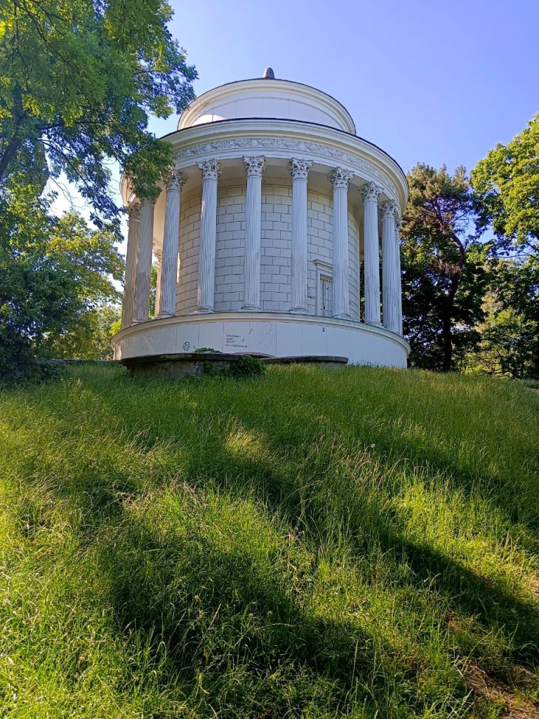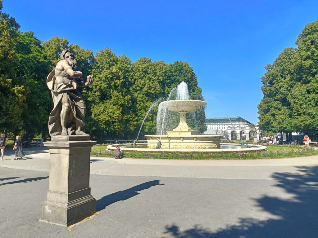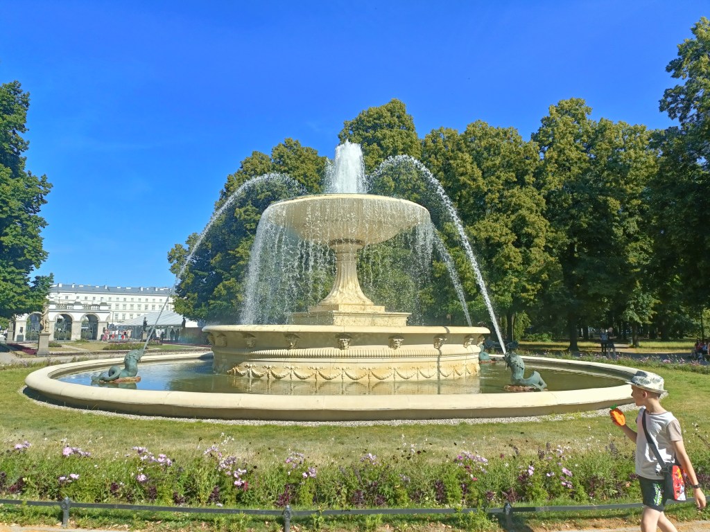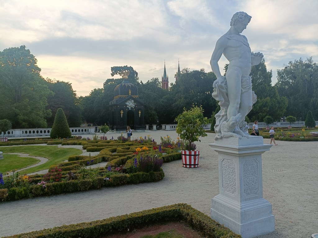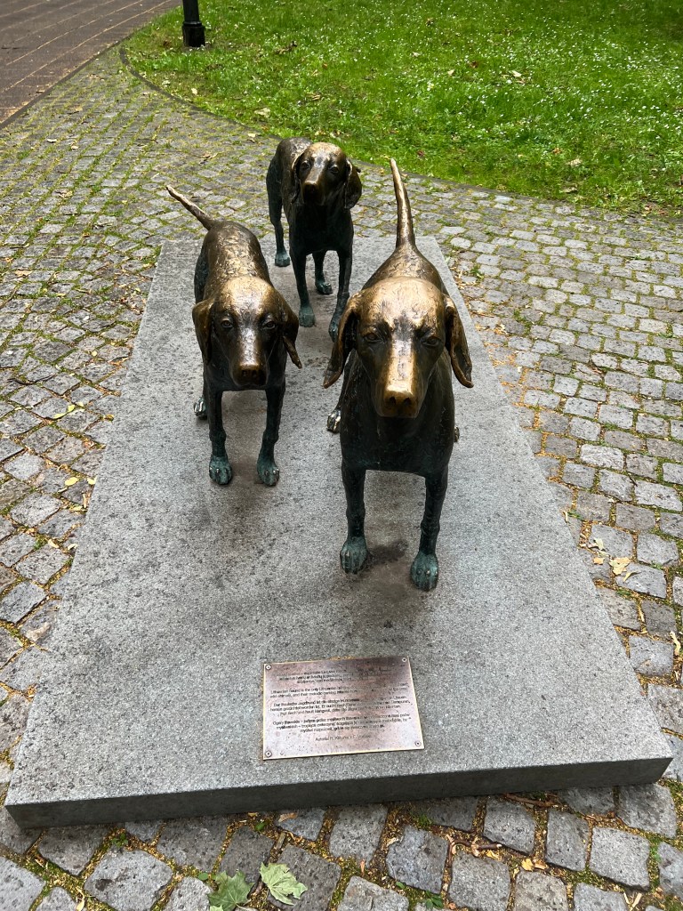 下山之後右轉,沒有走在來程的路上,而是沿著「維爾尼亞河」踏進城市公園——「伯納丁花園」(Bernardine Garden),這裡夏季樹林茂密,花壇與小徑都維護得很好,還有幾座可愛的雕塑。