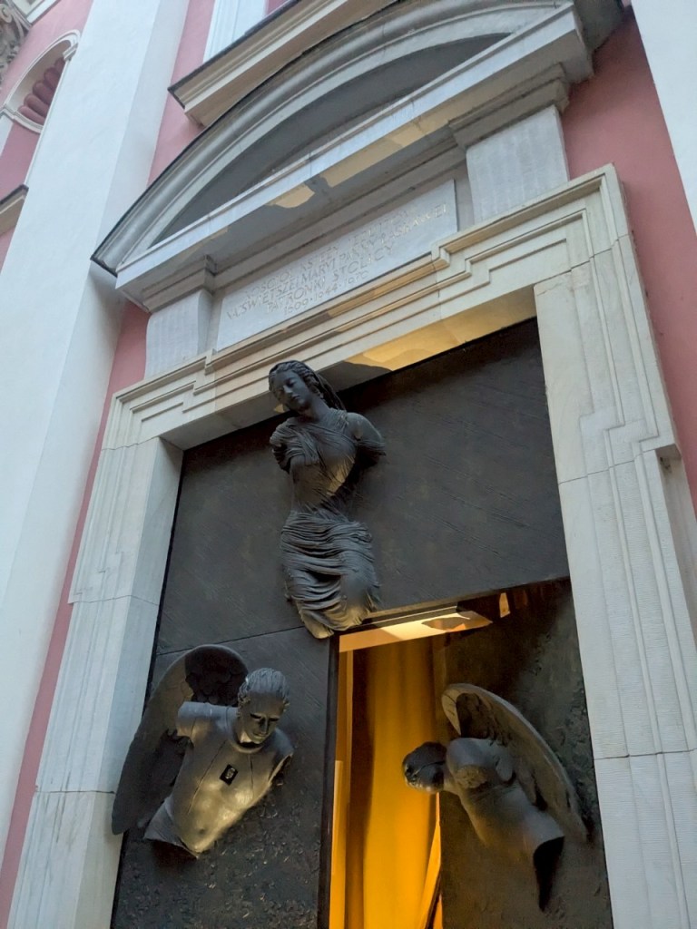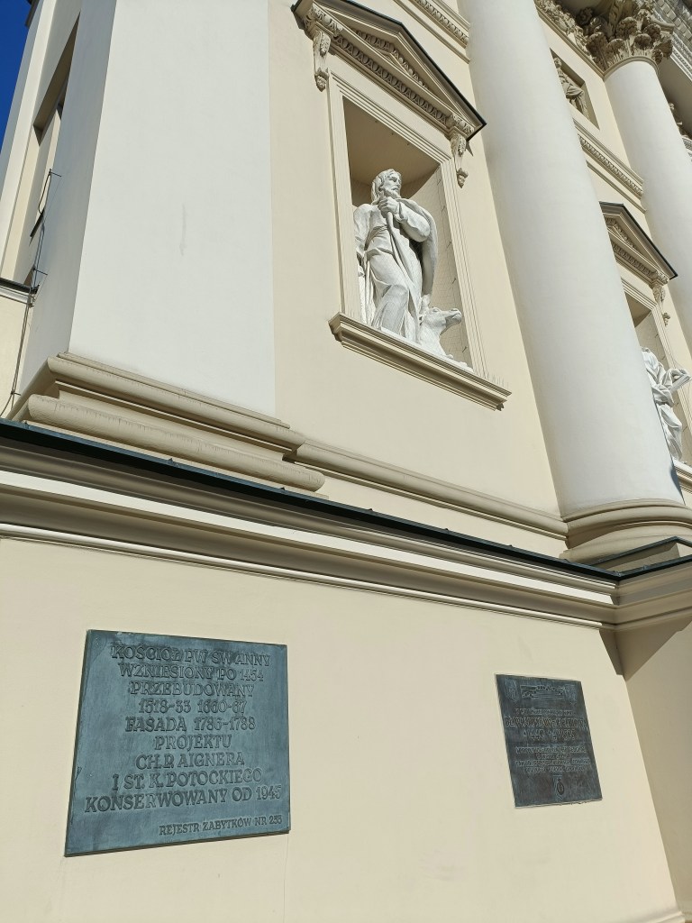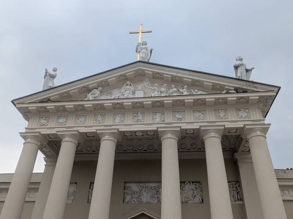 山牆上雕刻著三尊聖人雕像,分別象徵「立陶宛」守護者與「基督」信仰的重要人物–「聖斯坦尼斯洛瓦斯」(St.Stanislovas)、「聖愛蓮娜」(St.Elena)及「聖卡西米爾」(St.Casimir),這些雕塑於1997年修復,為整座教堂增添神聖與莊嚴的氛圍,整體建築線條優雅、視覺對稱,是「波羅的海」地區最典型的「新古典主義」宗教建築之一。