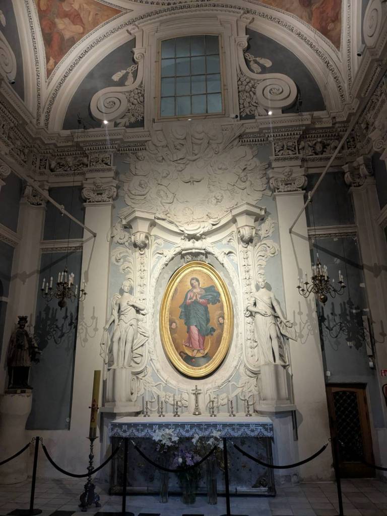 高祭壇兩側的側廊後壁龕中,有「巴洛克」風格的灰泥寓意雕塑,由雕塑家「托馬索·里吉」(Tomasso Righi)於1785年至1791年間創作。南側中殿有「鄰人之愛」(Love of Neighbor),描繪一位強壯男子向盲人乞丐分發麵包。人物彼此轉向,透過握餅的手勢相連。人物體型不同而更凸顯強者的力量與乞丐的渺小,並幫助表達慷慨與慈悲的美。