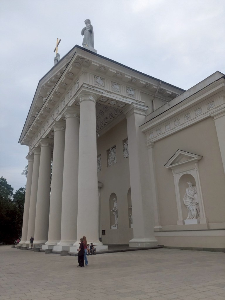 向西沿著Bernardinų gatvė再接上Pilies gatvė右轉,不到10分鐘就走到了。從對街望去,「新古典主義」風格著稱的「維爾紐斯主教座堂」,其潔白的外觀即使在陰雲下仍顯得格外明亮。