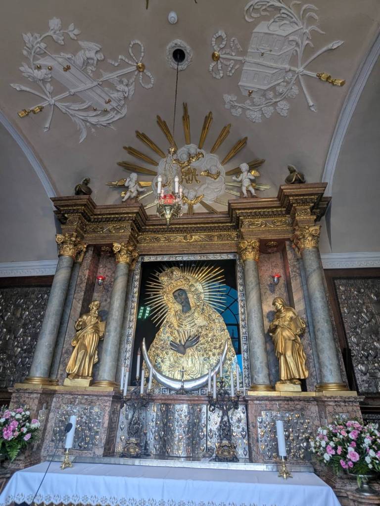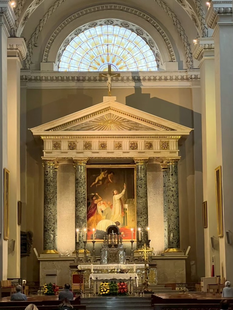 在聖殿深處,「主祭壇」(High Altar)以潔白柱式與對稱的「新古典主義」柱廊設計,襯托出祭壇中央的宗教畫像與金色裝飾,門廊上方有一座十字架,雕刻有被釘十字架的「基督」像(製作於1805年),整體以典雅的風格靜靜矗立而顯得莊嚴而神聖。