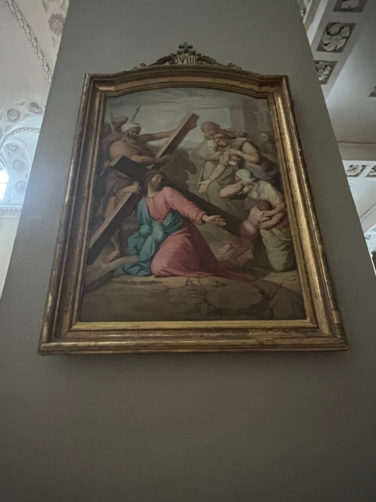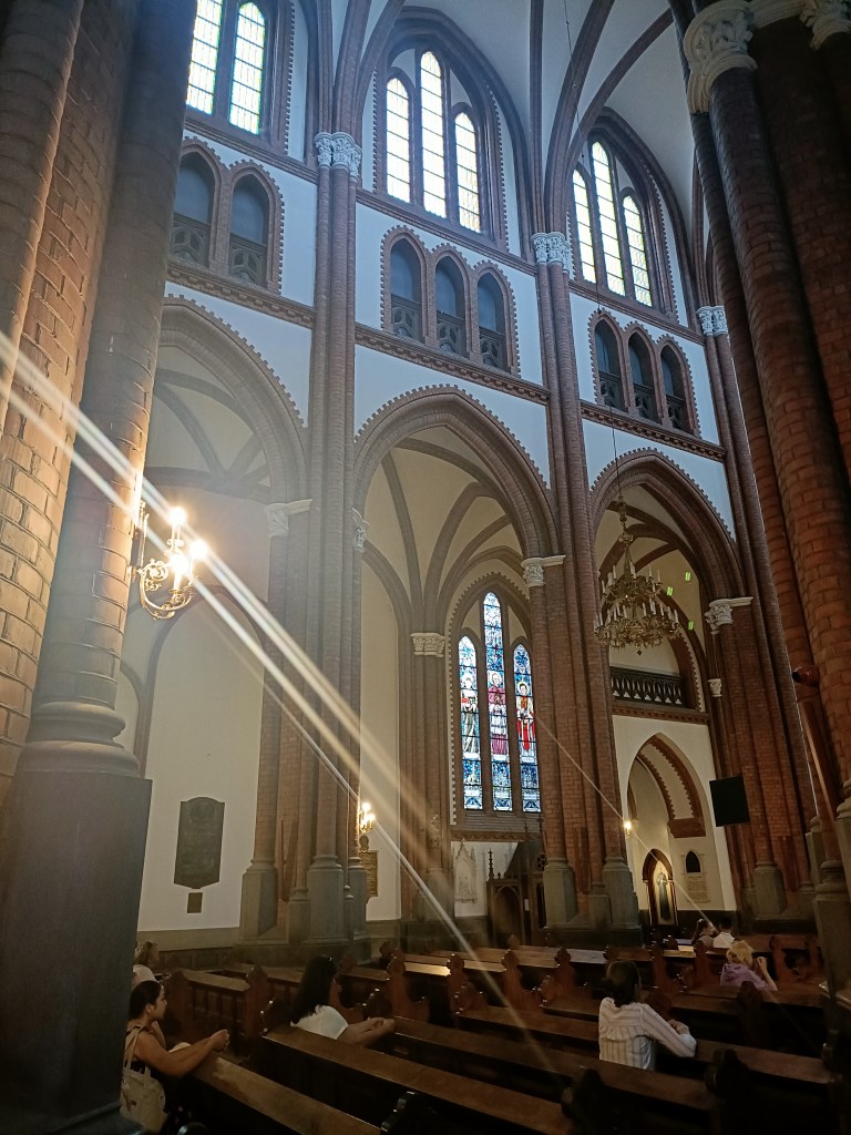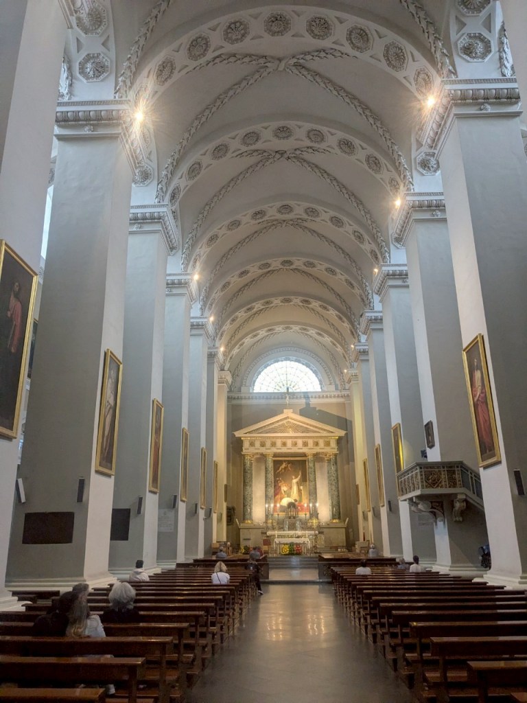 進入教堂參觀,內部仍保留有「哥德」、「巴洛克」與「文藝復興」的藝術元素,內部空間由巨大的柱子分為三個中殿,牆面則由「多立克」式壁柱分隔秩序,中間穿插著帶有三角形山牆的側禮拜堂門廊。