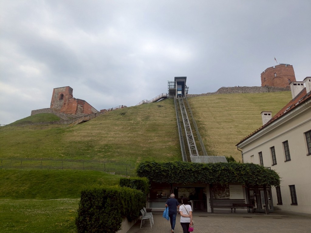 發現有登山纜車耶!好迷你的車廂。因為要登上「城堡山」(Castle Hill)除了要爬東側蜿蜒的山路之外(約10分鐘),若搭「格迪米納斯山纜車」(Gediminas Hill Lift)上下山就相當便利了,來回票價僅需3歐元(單程每人2歐元,往返3歐元,現場可使用現金或信用卡付款),登上山頂,可將「維爾紐斯」的舊城與新城全景盡收眼底,景色相當壯麗。