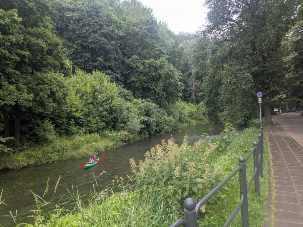 看到處處淺灘的「維爾尼亞河」上竟然有人划著小船溯溪呢!