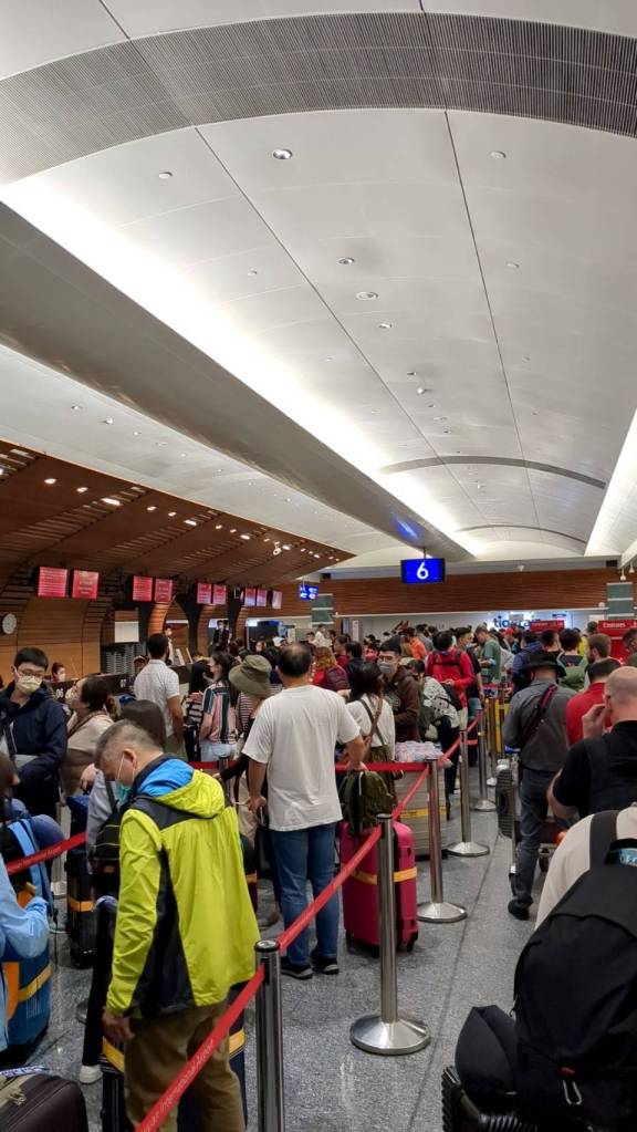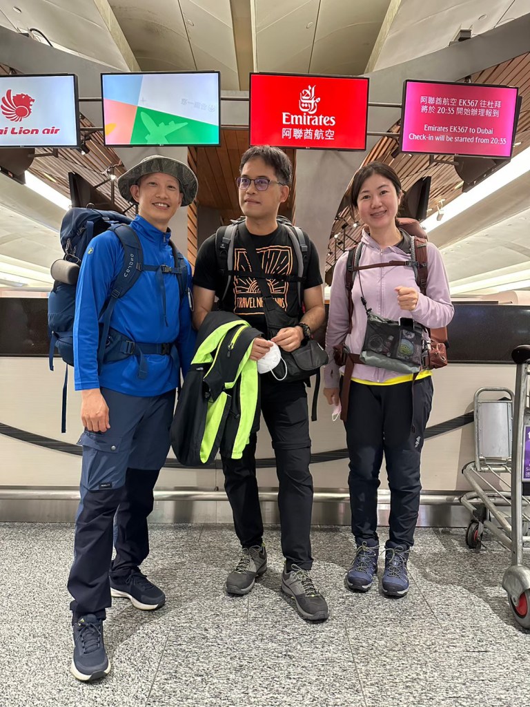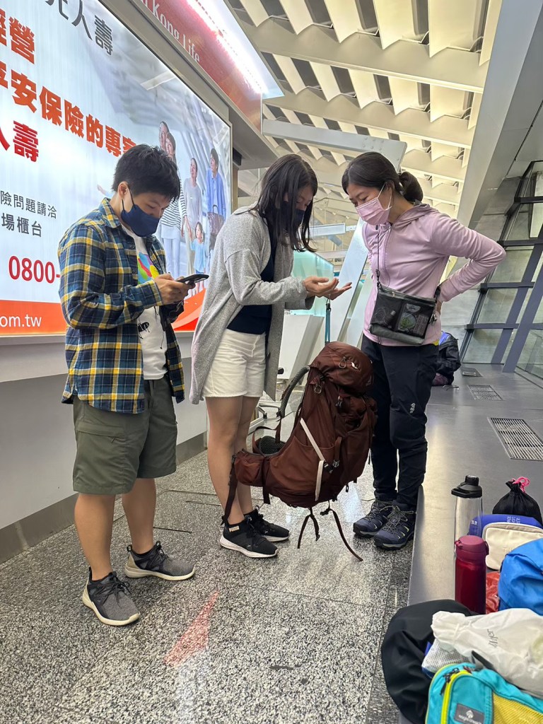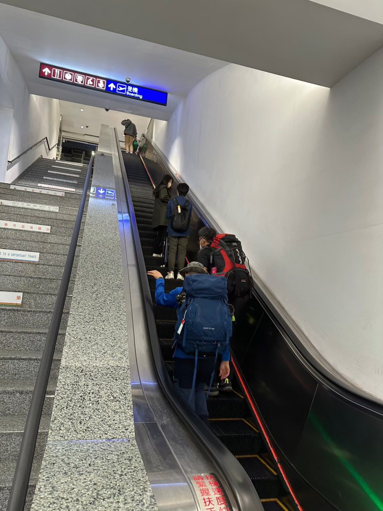 半小時後,Takeshi跟Rebe完成check-in了,而我比較慢,又過了15分鐘才完成,也算是學到教訓,下次真的要先線上報到才對。我們再次將行李打包後,在櫃檯前方來個朝聖者大合照,素菁姊送我們到出境前的手扶梯,並幫我們拍下出發的背影。