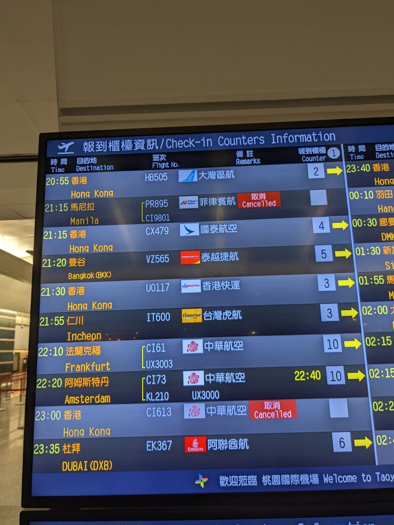 我們搭的「阿聯酋航空」航班是「EK367」,晚上11:35出發,先前我們三人幫約好在晚上8點於第一航廈的「阿聯酋航空」櫃台碰面;其實Takeshi早就到了,但他跟他老婆先去吃晚餐,而Rebe還在高鐵站跟朋友吃飯,所以我就在新光人壽服務台那邊等他們。半小時後,Takeshi他們先到了,因為怕被查到行李超重遭攔截,所以我們先把較重的物品拿出來給素菁姊保管,以防check-in時秤重被打槍。很快地8:35了,check-in的人潮瞬間成形,而Rebe大胃王還不知在何處吃飯呢,所以我跟Takeshi就先跑去排隊了。