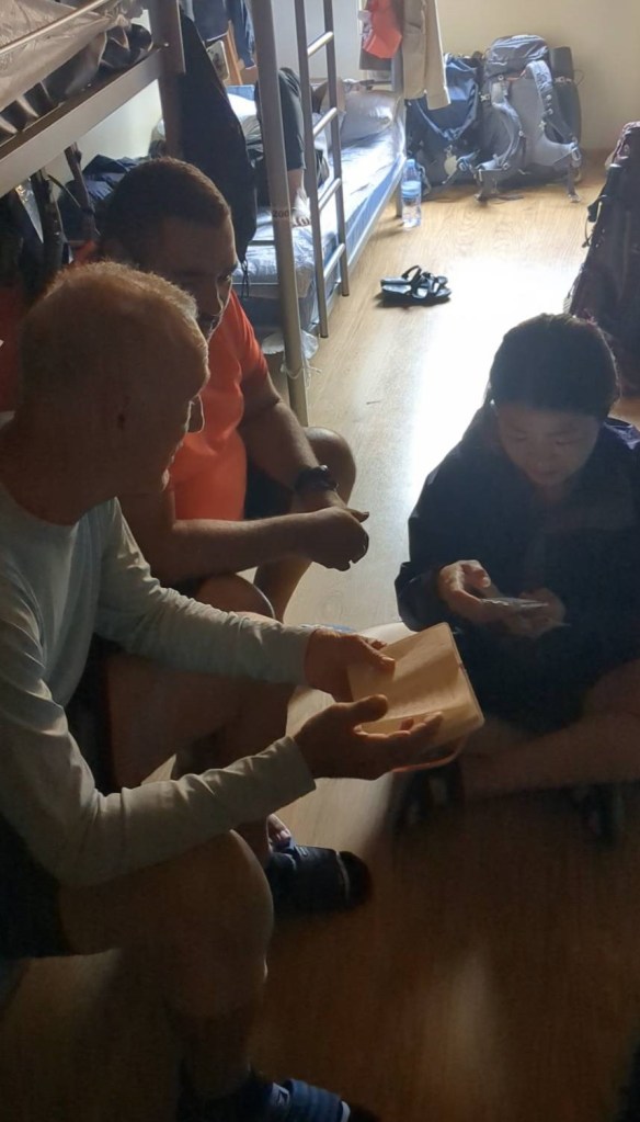 回到住宿點也6點了,看到幾個朝聖者身上有著熟悉的藍顏料笑著上樓。。。我先來到二樓嫻熟地作著定版沒難度的晚餐–鮪魚罐頭沙拉、優格、微波海鮮飯及西班牙國寶泡麵,而Rebe跑來廚房很高興地說她在房間遇到了Luis,後面發現我們這次的朝聖同梯幾乎都住在這,包含選擇這裡作為朝聖終點的艾莉西亞,即使今天路上錯過他們,但還是在這再次聚首;我深覺得艾莉西亞很重視這10天旅途的友情,見她從中午一直跟相識的朝聖者邀飲啤酒,下午也是,傍晚8點更是把Luis及幾個巴西朋友從床上拖出去喝,她也幾乎每間大寢室去寒喧道別,我最後送給她一個來自台灣高雄的鑰匙圈作為紀念。