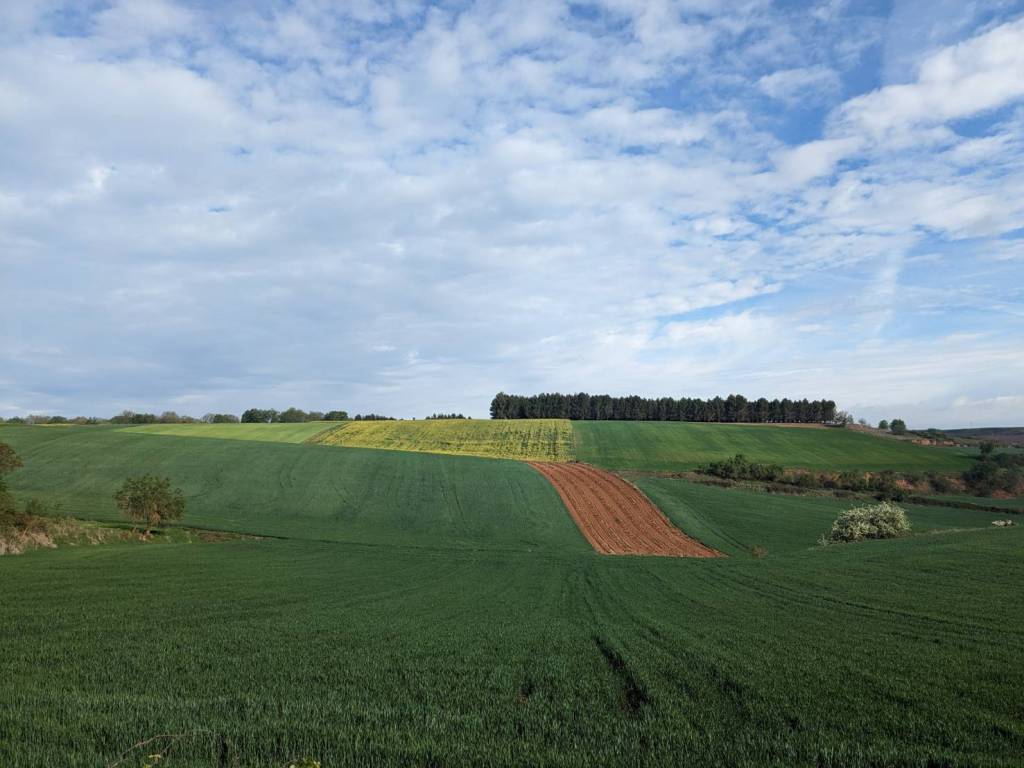 沿路盡是看不膩的風情–果樹園、油菜花田及牧草地,還有感覺走不透的砂石路,遠方那晨霧未退的山巒潑墨般似地與碧綠油亮的田野構描出極搭的韻調。在這遇見Luis及他的巴西朋友、夫婦,也知道他另一個巴西醫生朋友膝蓋不舒服,還在後面慢慢走著。