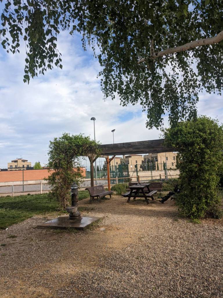 我們選在一處有涼亭的公園休息,把昨天在Dia超市買的麵包、水果及汽水拿出來野餐,旁邊也有飲水處及垃圾桶,很方便洗手洗臉。在這裡遇到了一位來在荷蘭鹿特丹的女生,她是個單獨步行的朝聖者,從她的言談舉止可知蠻獨立活潑的。