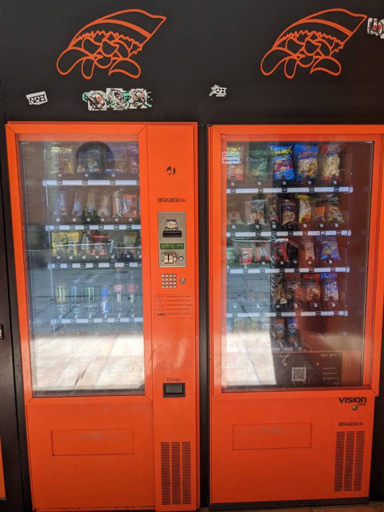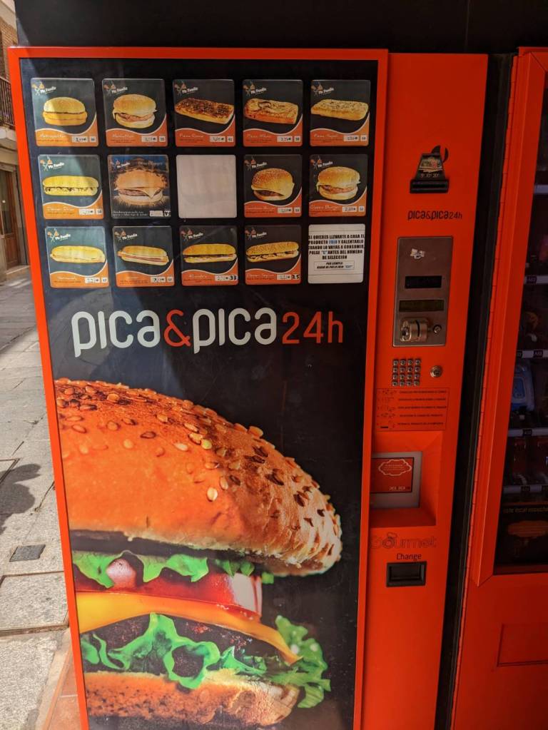 對面擺有亮麗紅色的漢堡、飲料與零食自動販賣機。