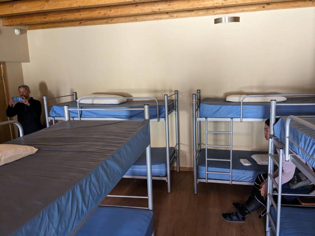 此庇護所三層樓高,收費13歐元,可說是大型庇護所,可容納約500多人。也由於我們早到,所以優先被安排到下鋪,更可以先佔領地形要點,搶到可放背包的椅子及插座。