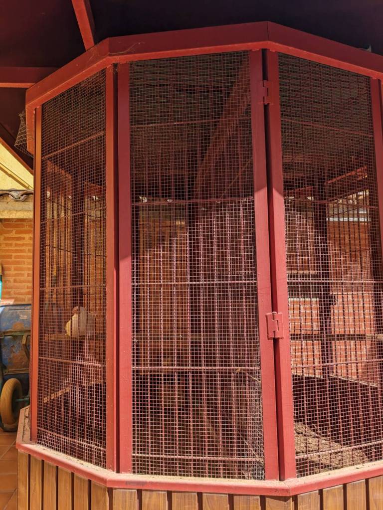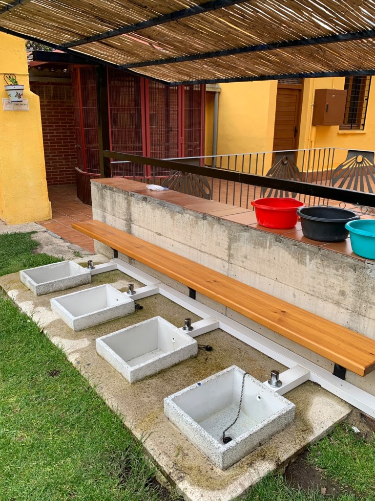 一樓後院有洗衣、曬衣的地方,還有庭院桌椅、泡腳池,也養著幾隻中世紀以來死而復活傳說的公雞與母雞。