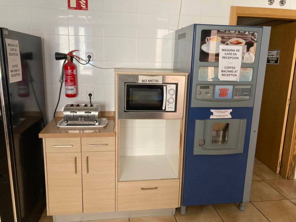 二樓有用餐空間,有冰箱、微波爐、餐具及販賣機等等,可惜就是沒有瓦斯爐或電磁爐可以使用而已。