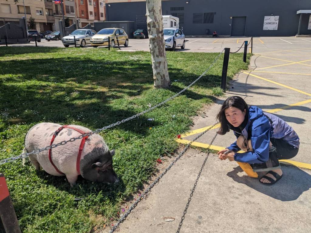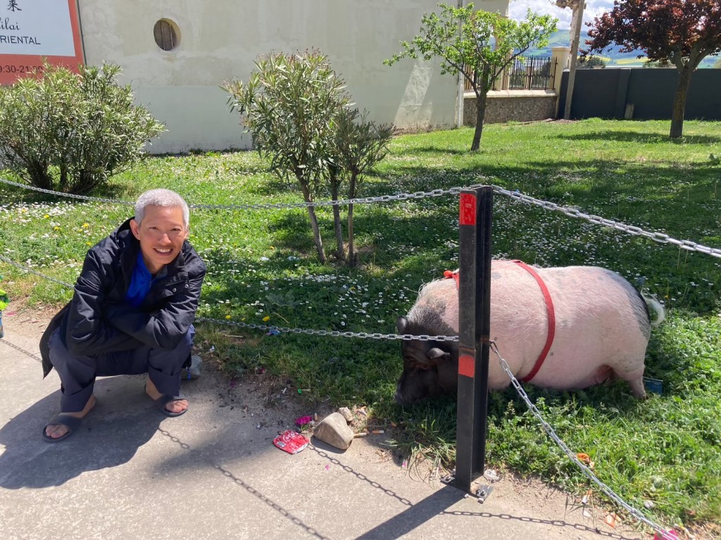 最吸引人的就是店門口的草地上,養了一隻肥嘟嘟的寵物豬,黑臉白身有碩大身軀,Rebe很喜歡跟牠對話。