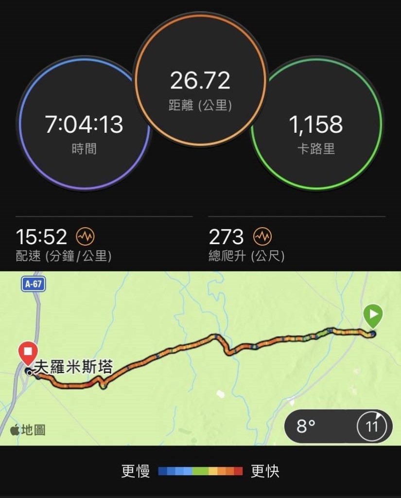 昨晚睡的很好,因為這間私人庇護所的床位既舒適又有拉簾,而同間「室友們」也不太會打呼,所以很享受在這的睡眠時光;簡單地盥洗及整理後,我們在6:30分出發,首先要到隔壁旅舍找Genie姐一起啟程。這時發生一個小插曲,就是前門被反鎖了,東翻西搜地找不到鑰匙,還好Rebe發揮她的專長,嗅到另一條往下一間車庫的小門可以離開,否則我們只能等7點早餐店開了才能走吧…感謝Rebe姐。