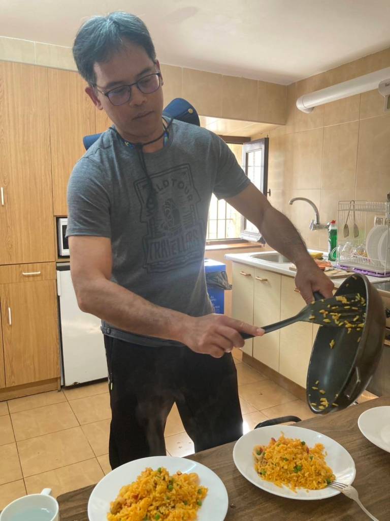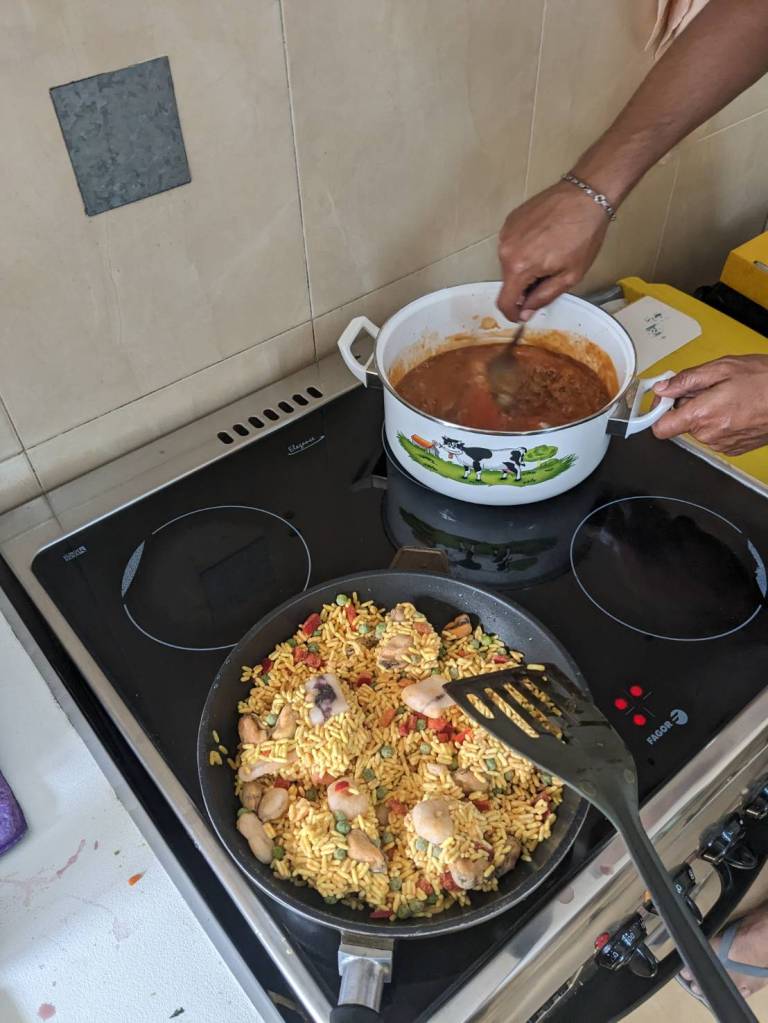 我們再次進去Dia買今晚的晚餐及明天的早午餐,剛進去就遇到上午的型男主廚,他是來這個城鎮補貨的;我們買了海鮮燉飯、肉醬千層麵及麵包,回去後剛好遇到義大利小哥在煮肉醬義大利麵,看他嫻熟地將蘿蔔、洋蔥切佐下料燉肉醬,細心地拌著,即使沒吃到也心靈享受到。原來義大利小哥已旅居在西班牙馬德里10年了,他說義大利男生很會煮菜,從他對煮肉醬火侯及調料的講究,可以知道他所言不虛。