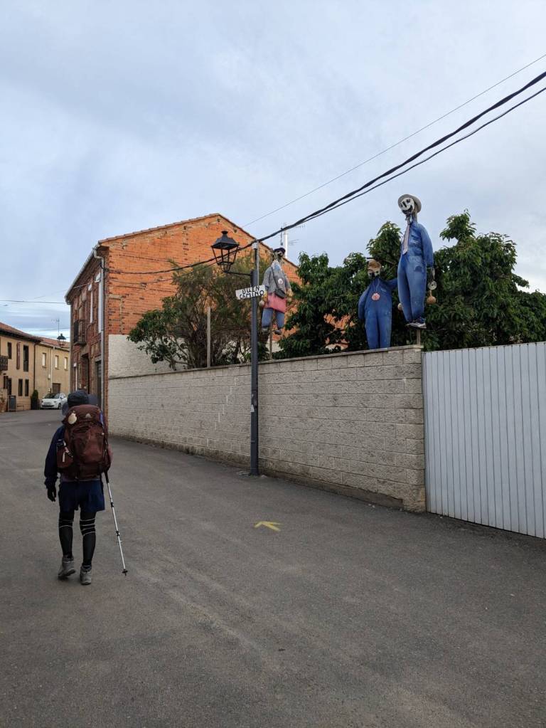 民宅圍牆上掛著幾個奇特的人形娃娃,又寫上「一路順風」(Buen Camino),格外覺得有點詭異。。。