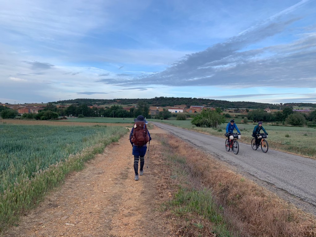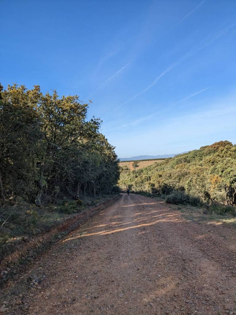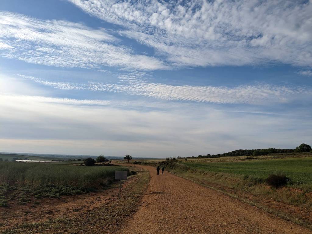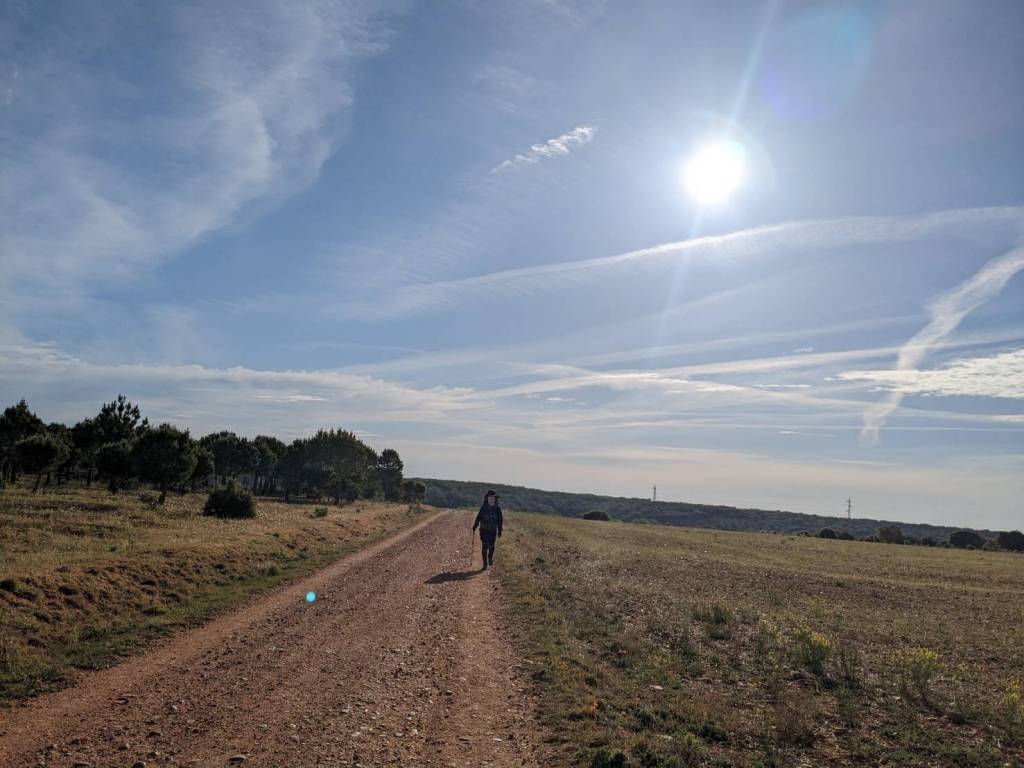 今天的路程看似是簡單的18公里,一開始是平坦的田野砂石路,捨不得地再次回望一次「奧爾比戈醫院鎮」,晨曦的金黃映襯著天空的晴藍格外迷人。
