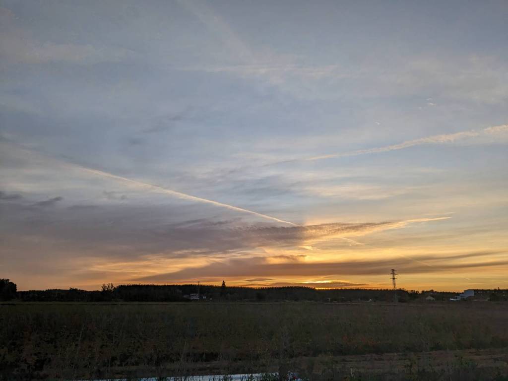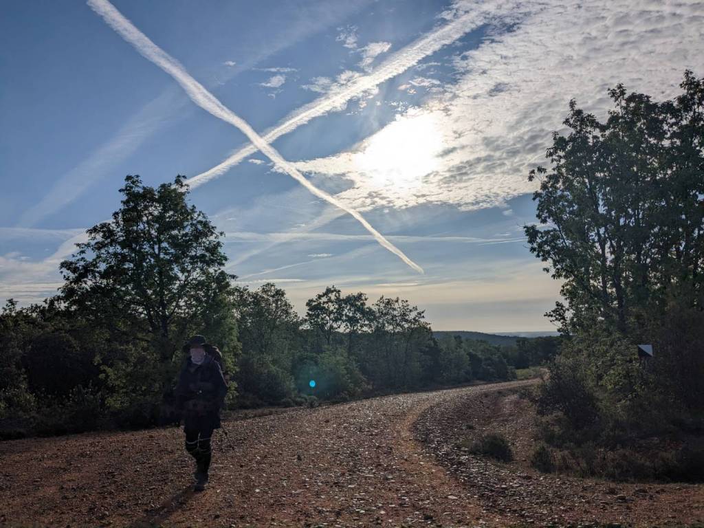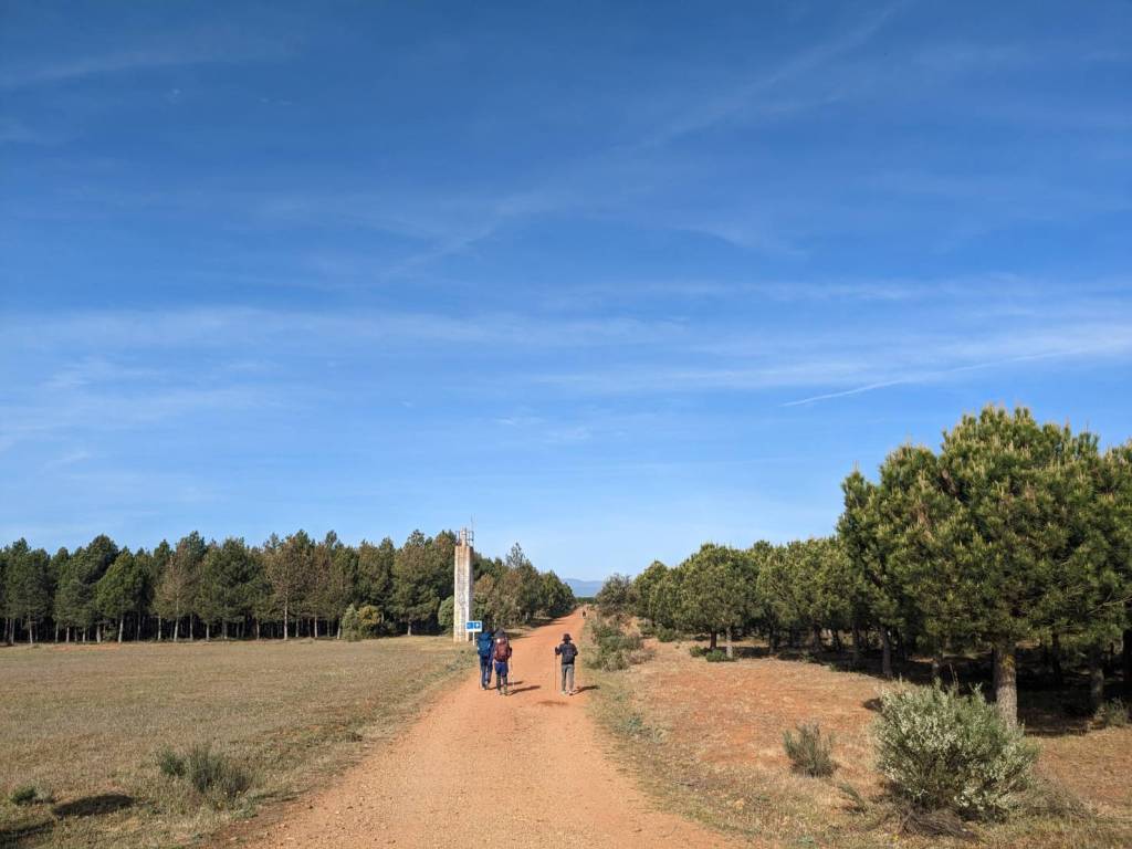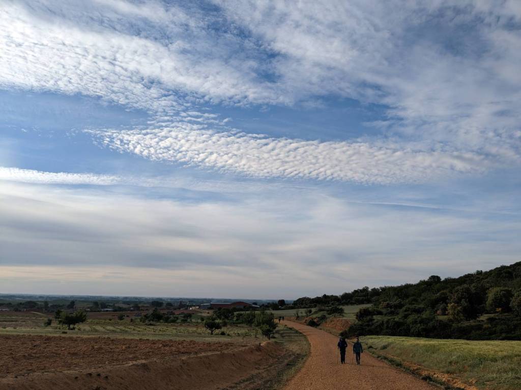 今天的路程看似是簡單的18公里,一開始是平坦的田野砂石路,捨不得地再次回望一次「奧爾比戈醫院鎮」,晨曦的金黃映襯著天空的晴藍格外迷人。