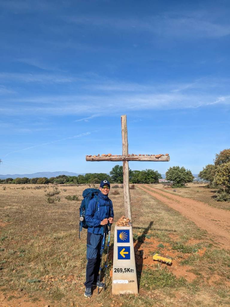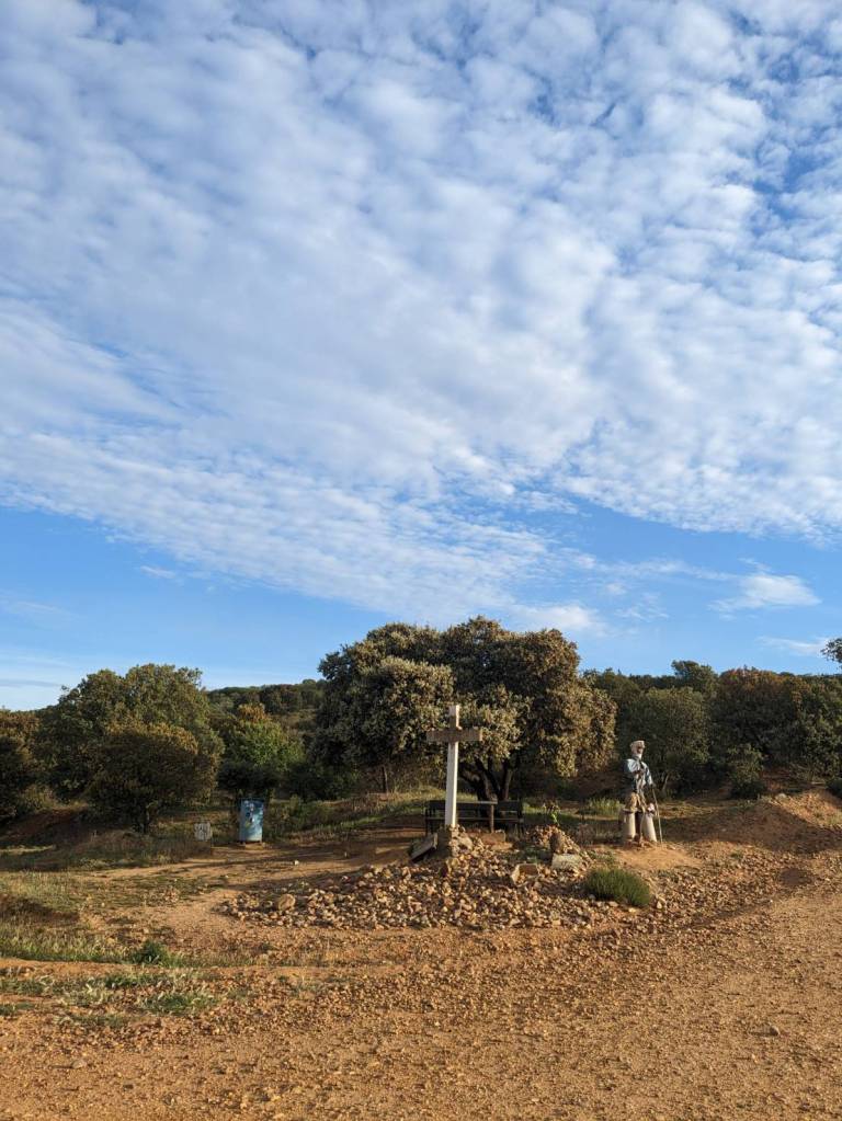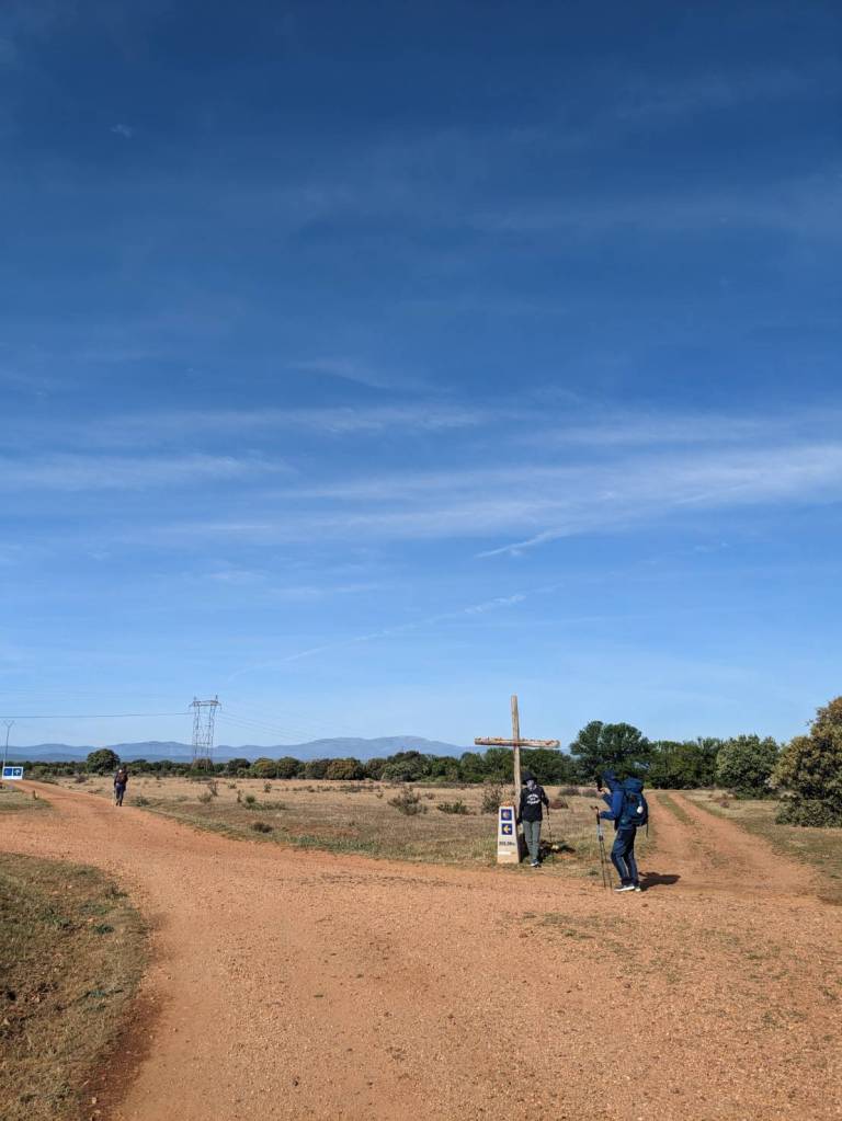 來到叉路口處的十字架–Cruz y escultura del peregrino,這是歡迎朝聖者休息的地方,有些旅人會在白色襯衫上寫字紀念。