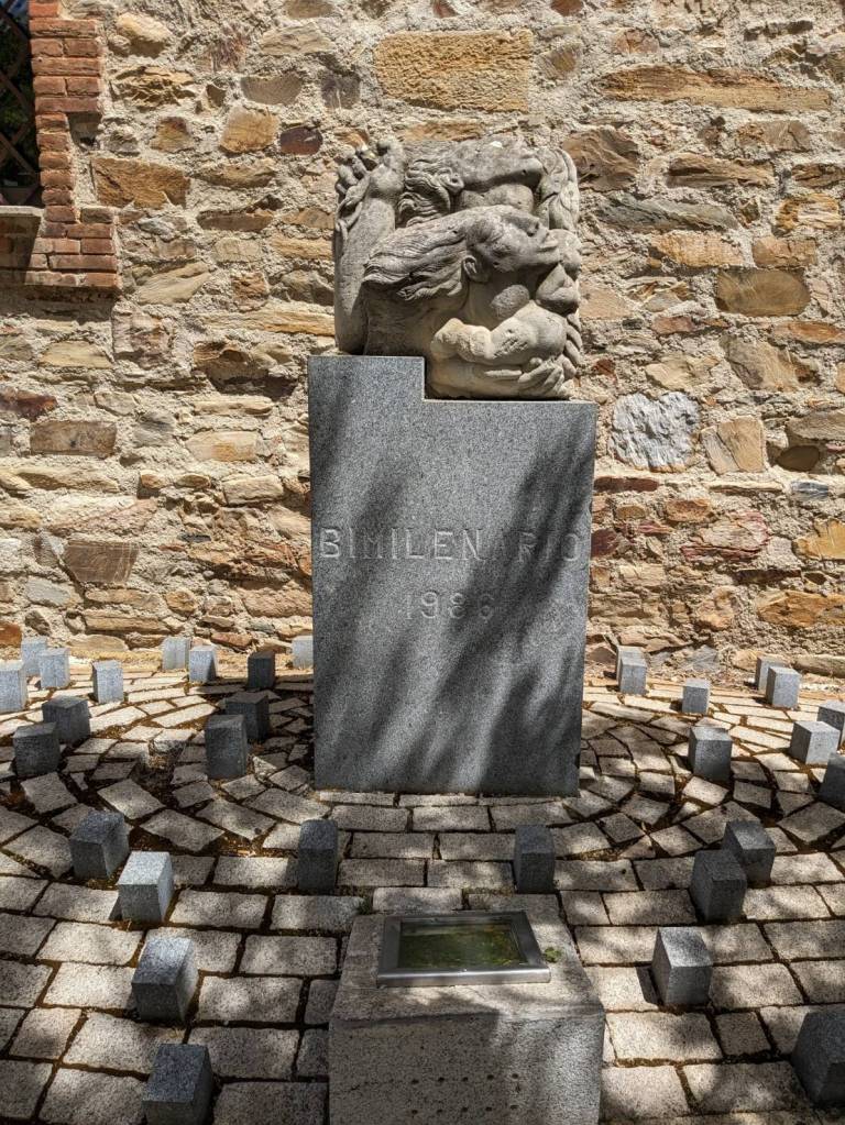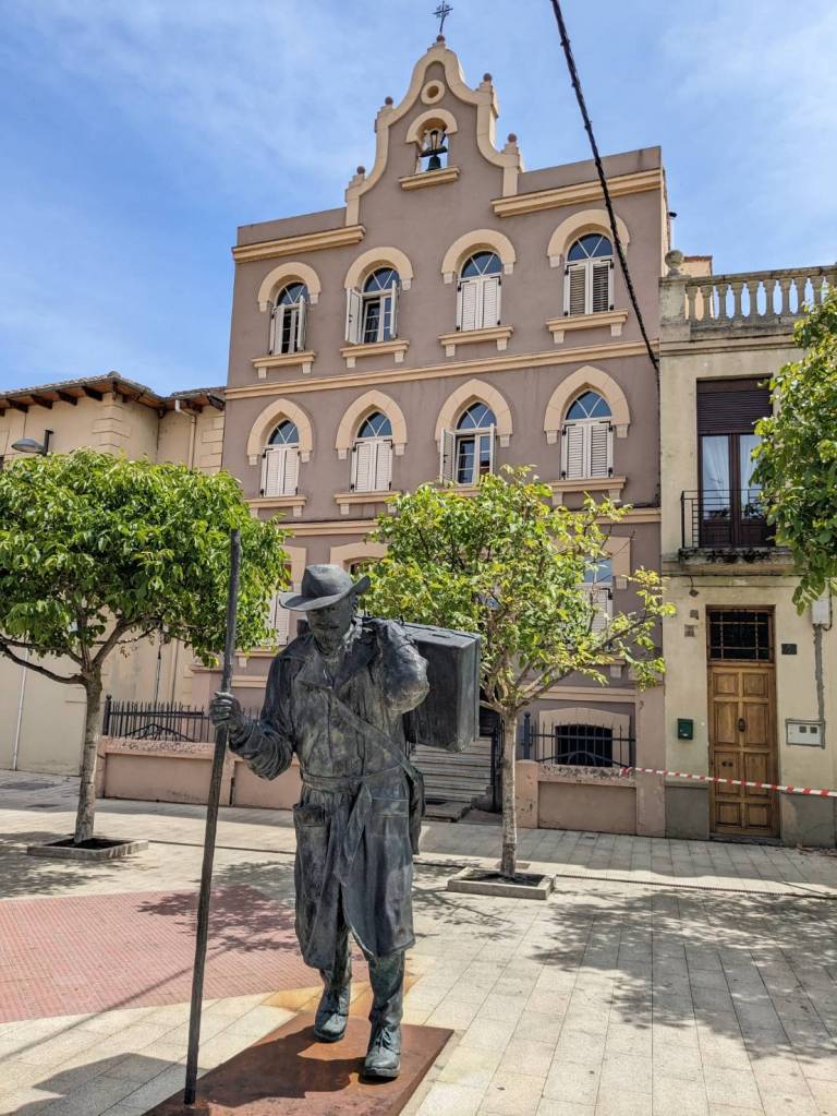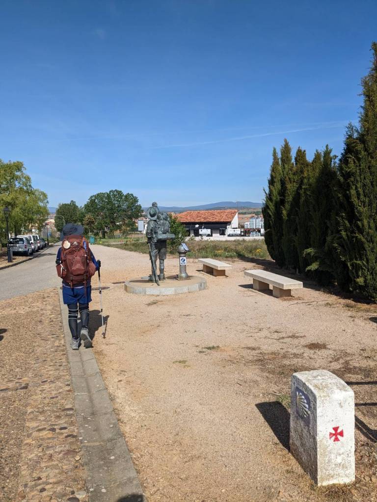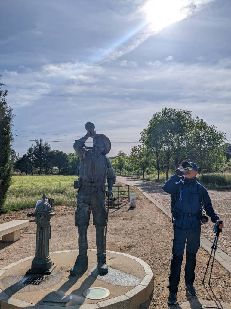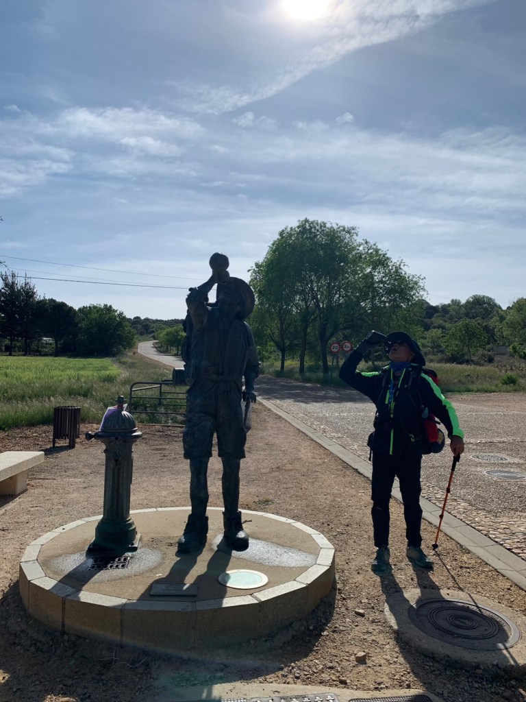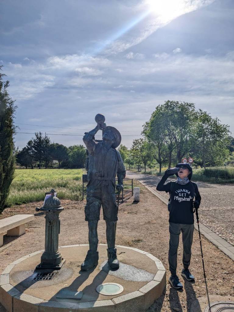 往下坡走,來到山腳下入城處,有一座朝聖者喝水的雕像–Fuente peregrino sediento,這裡也有提供板凳及飲用水。