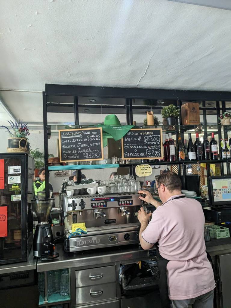 check-in並放好行李後,趕快下樓帶Genie姐找地方吃午餐,在熱心的西班牙大叔的介紹引領下,我們找到一間酒吧–El Bar de Carlos吃東西,我點了一份熱可可與吉拿棒,兩者搭配熱騰騰地吃真是美味。