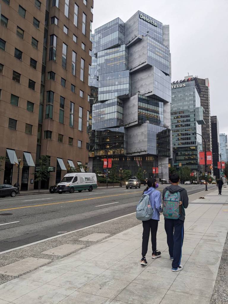 今早好似大家時差都調整差不多了,睡到6點多才起床,簡單微波熱披薩及麵包來吃,準備送小孩上課;上午7:45分出門,溫度15度有點微涼,走起路來很舒服,經過每天都看的到了「Deloitte大樓」。