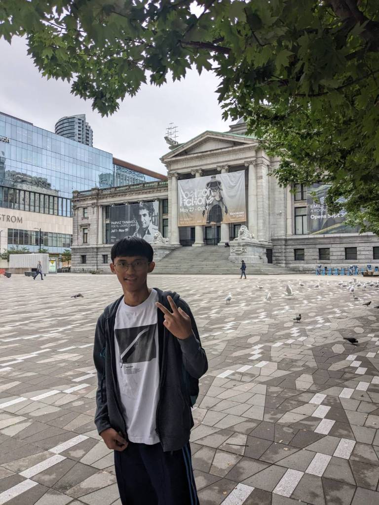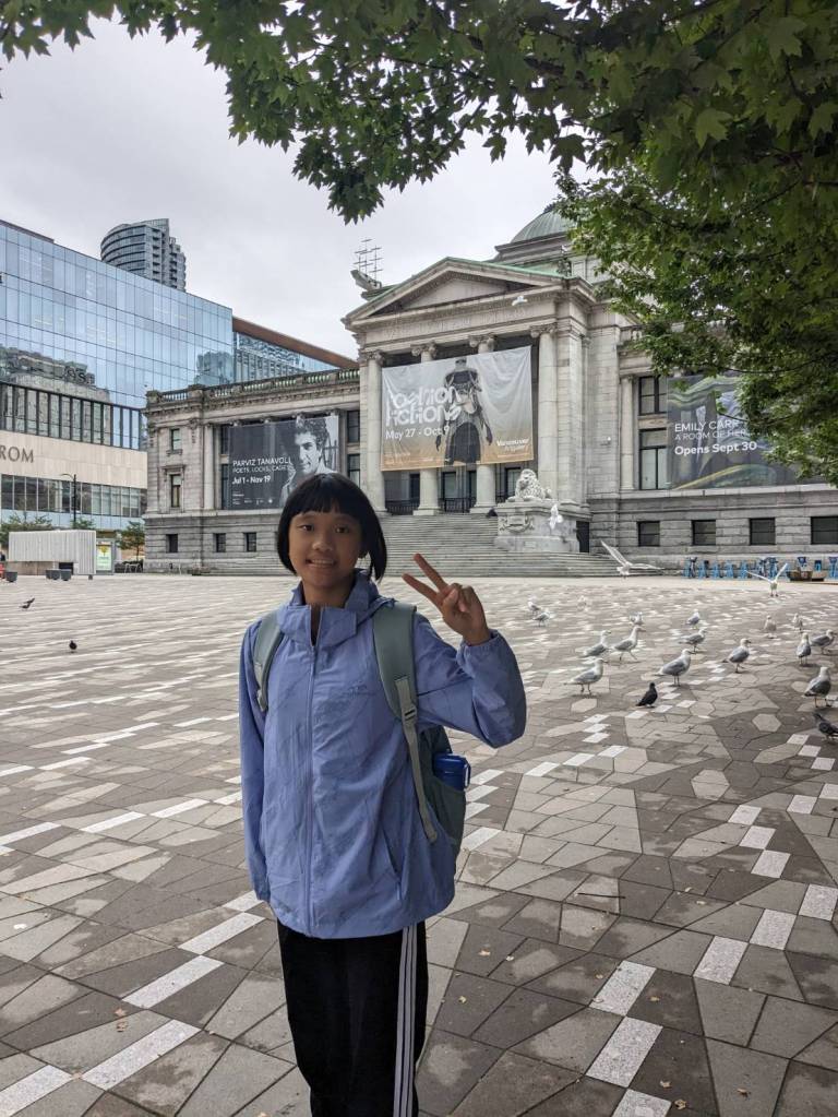 上學途中,在「溫哥華美術館」前廣場與鴿子群合影。