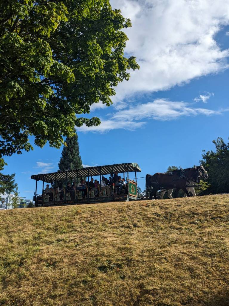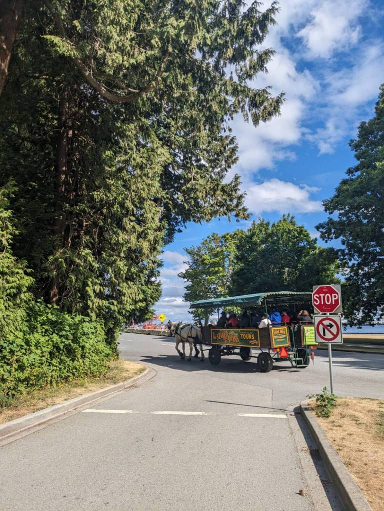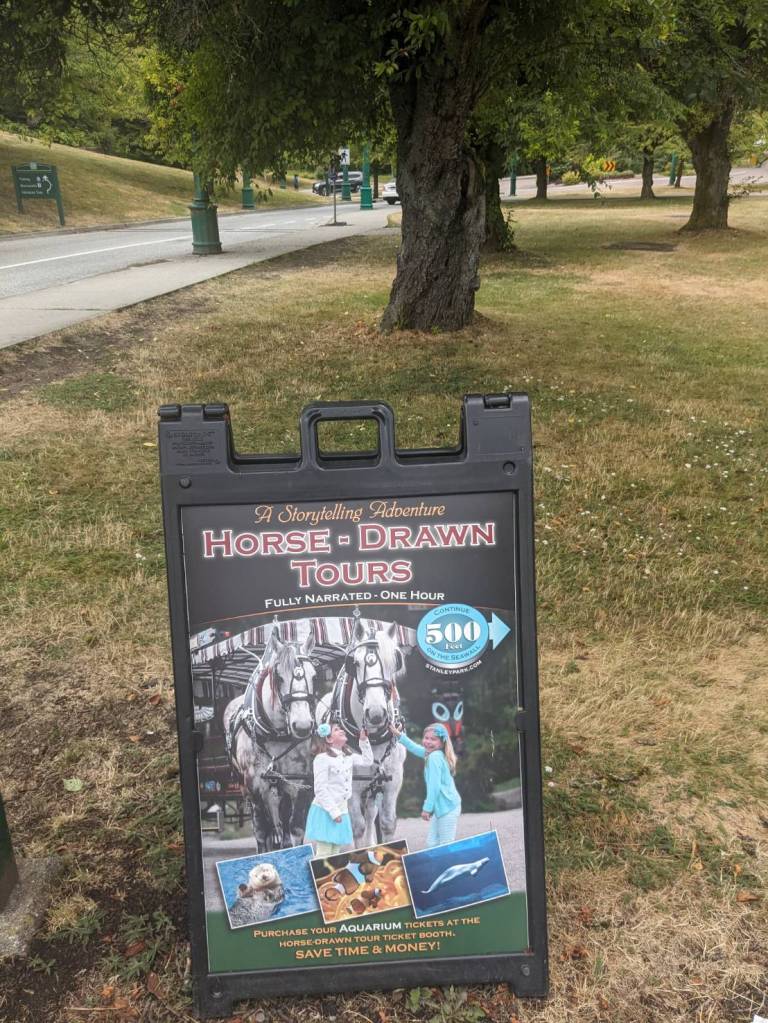 我們走約7分鐘到Georgia & Burrard公車站等「19號」公車。坐公車不到10分鐘即到達「史丹利公園」,一下車就看到「馬車之旅」(Horse-Drawn Tours)的廣告招牌。