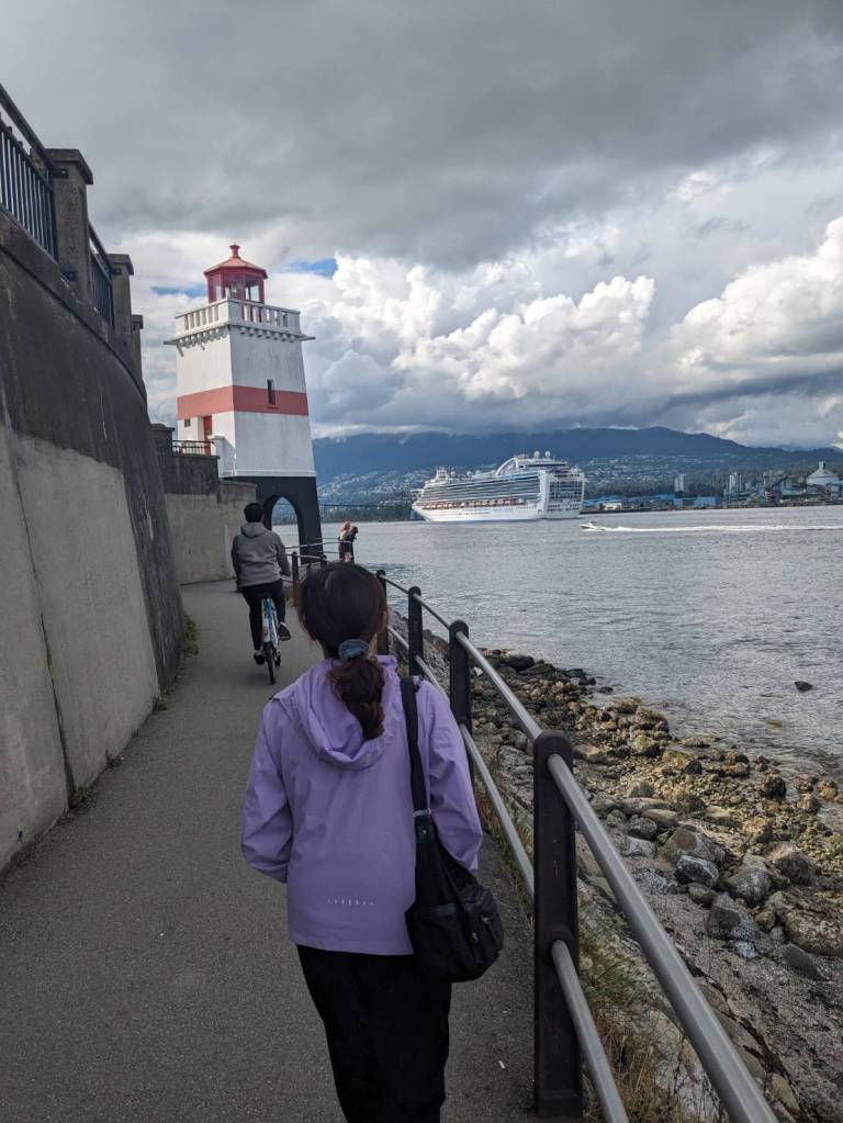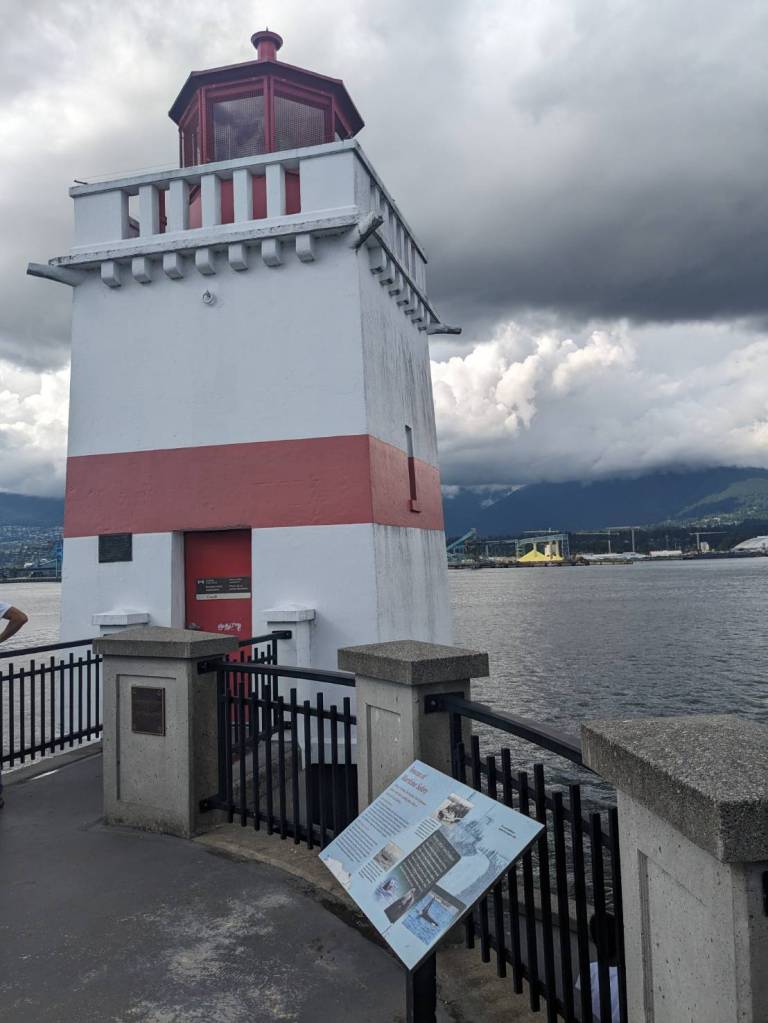 走到「布洛克頓角燈塔」(Brockton Point Lighthouse),位於「史丹利公園」北海岸,她面向「溫哥華港」,是一座白色和紅色油漆的古老燈塔,旨在紀念所有水手及創建溫哥華港口的人;若冬天下雪時,可看到北邊雪山如畫的背景。