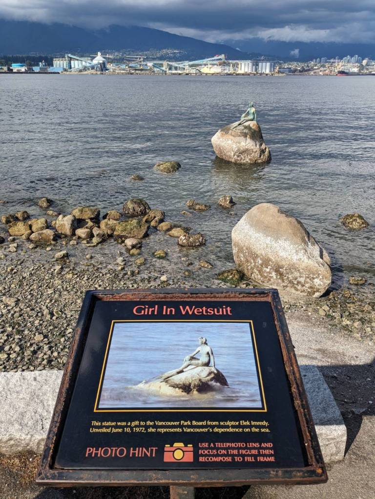 「穿潛水衣的女孩」(Girl in a Wetsuit),她是一個真人大小的青銅雕像,雕塑出一個穿著潛水衣的女人,腳上有腳蹼,她的面具推到她的額頭上,坐在「史丹利公園」近海的一塊巨大的潮間帶巨石上;她於1972年起已成為公園遊客及進港船隻找尋的美麗地標。