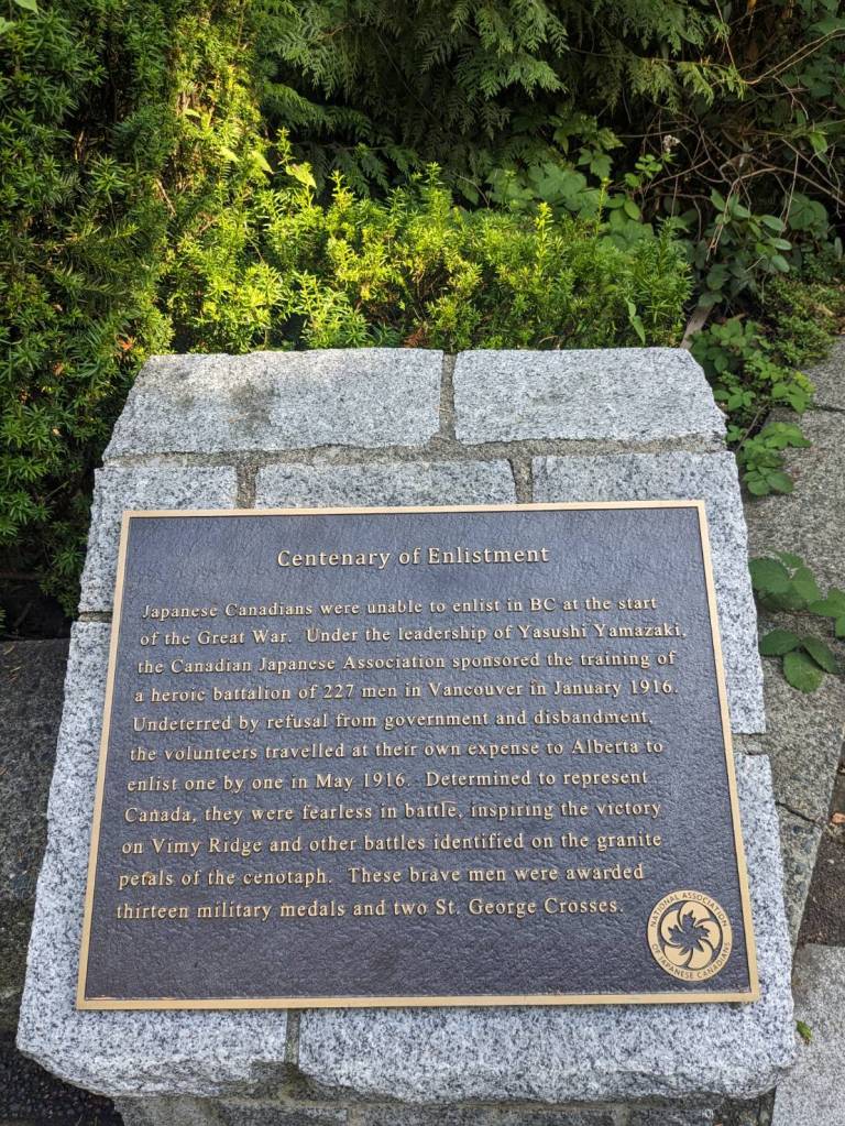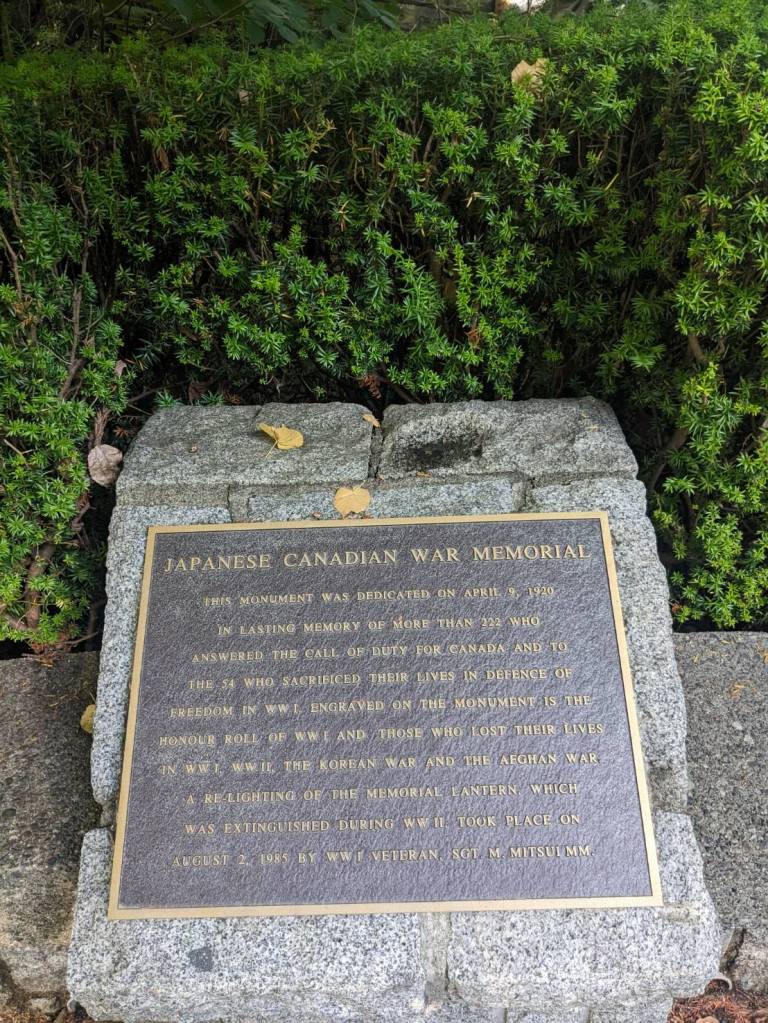 經過「日裔加拿大軍人戰爭紀念碑」(Japanese Canadian War Memorial),她起建於1920年,主為紀念第一、二次世界大戰、韓戰爭及阿富汗戰爭中陣亡的英雄們,沿路有日本櫻花樹排列在通往石碑的小路上。