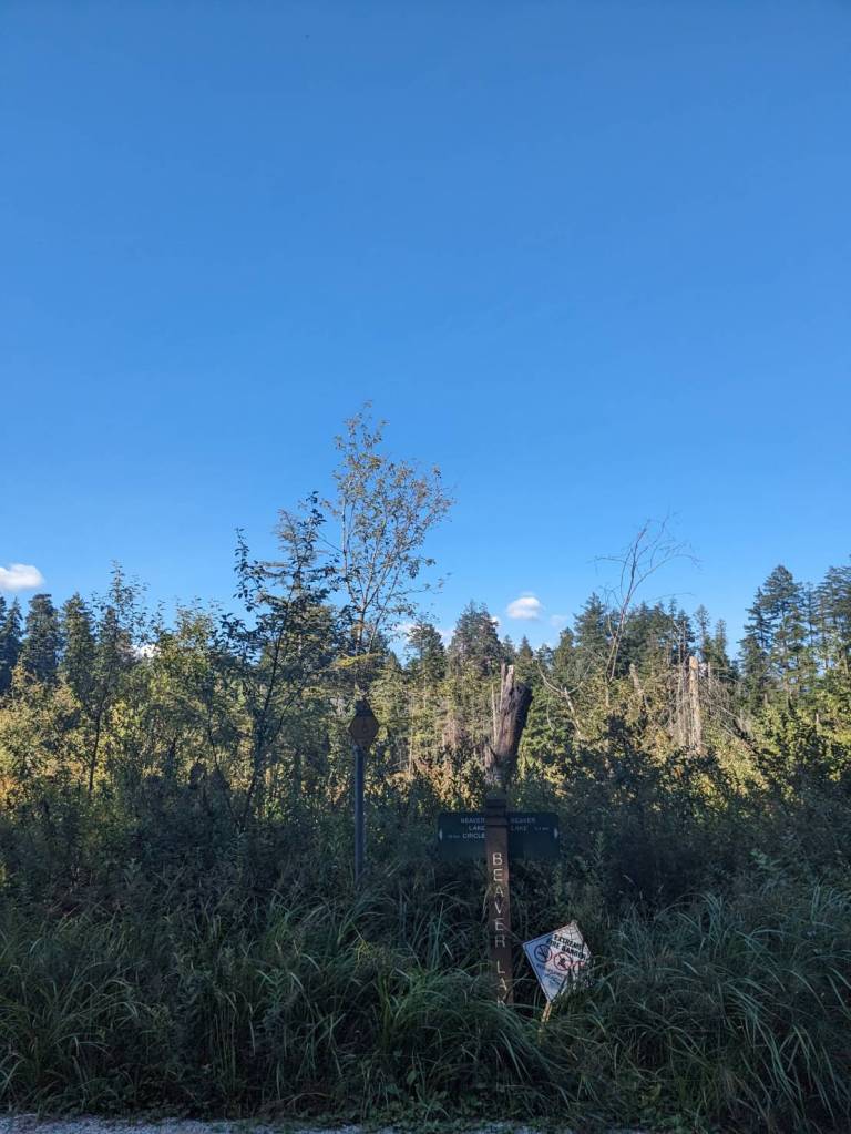很快地走到「河狸湖」湖邊,但是雜樹林及野草太長了,還看不到湖的真面目。
