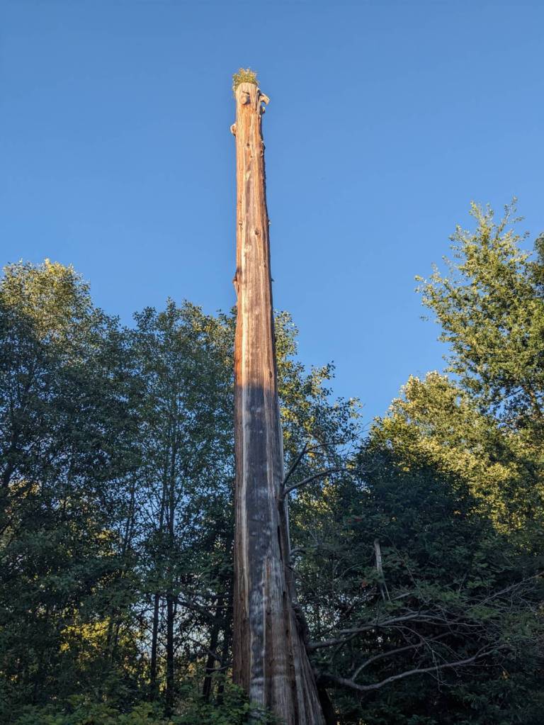 高聳的枯樹上方長了一叢綠樹,相當可愛。