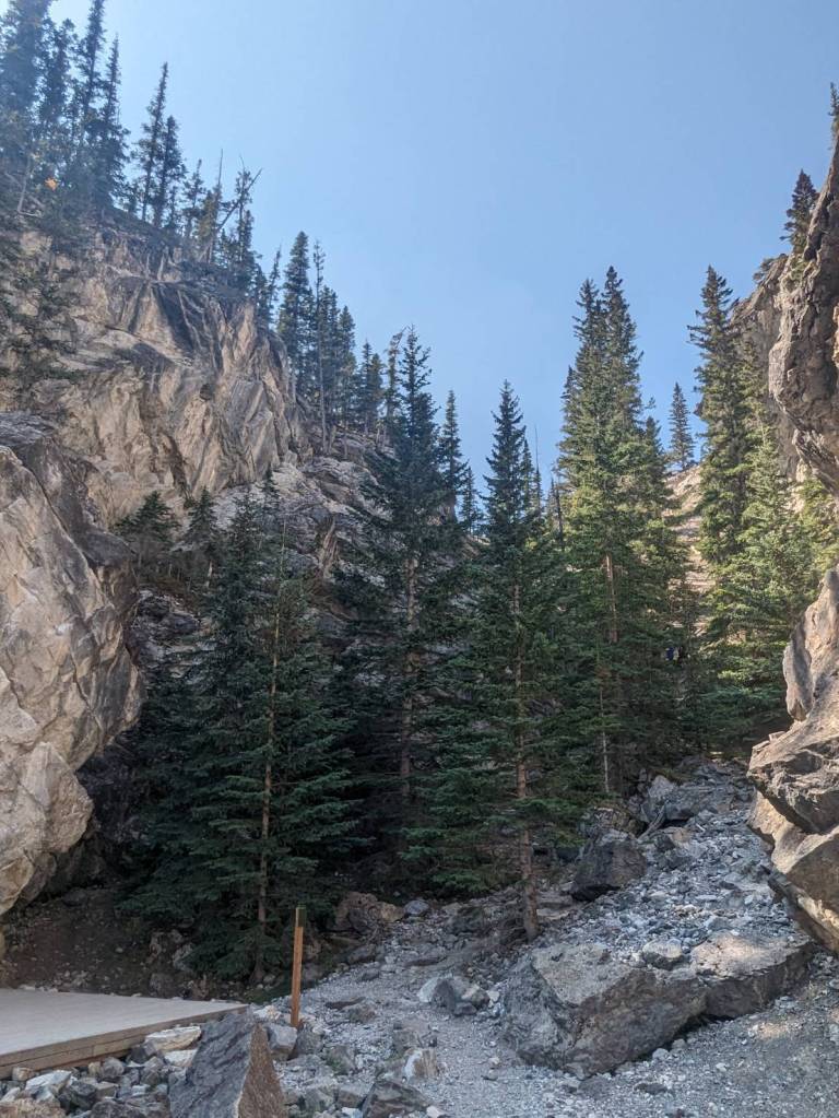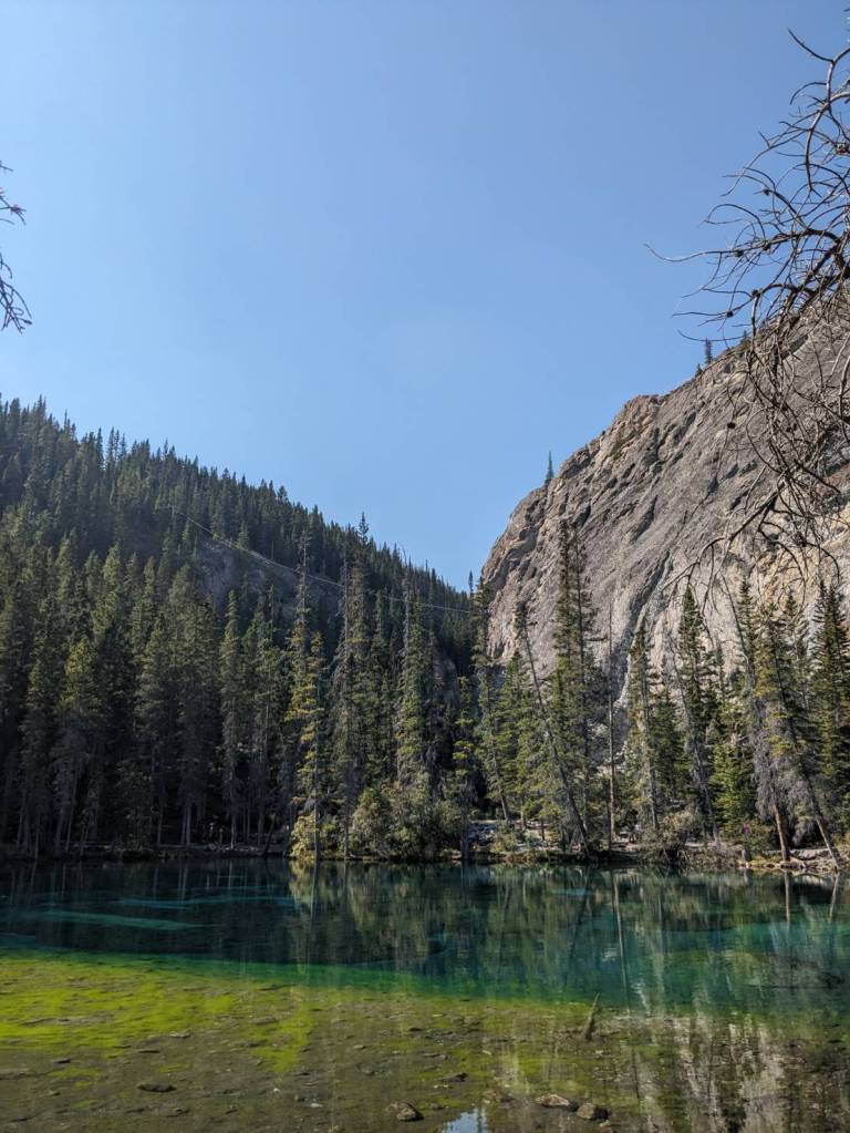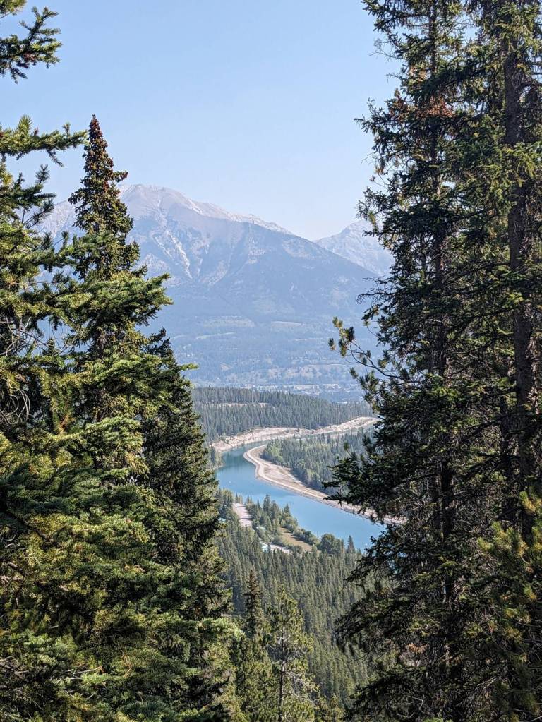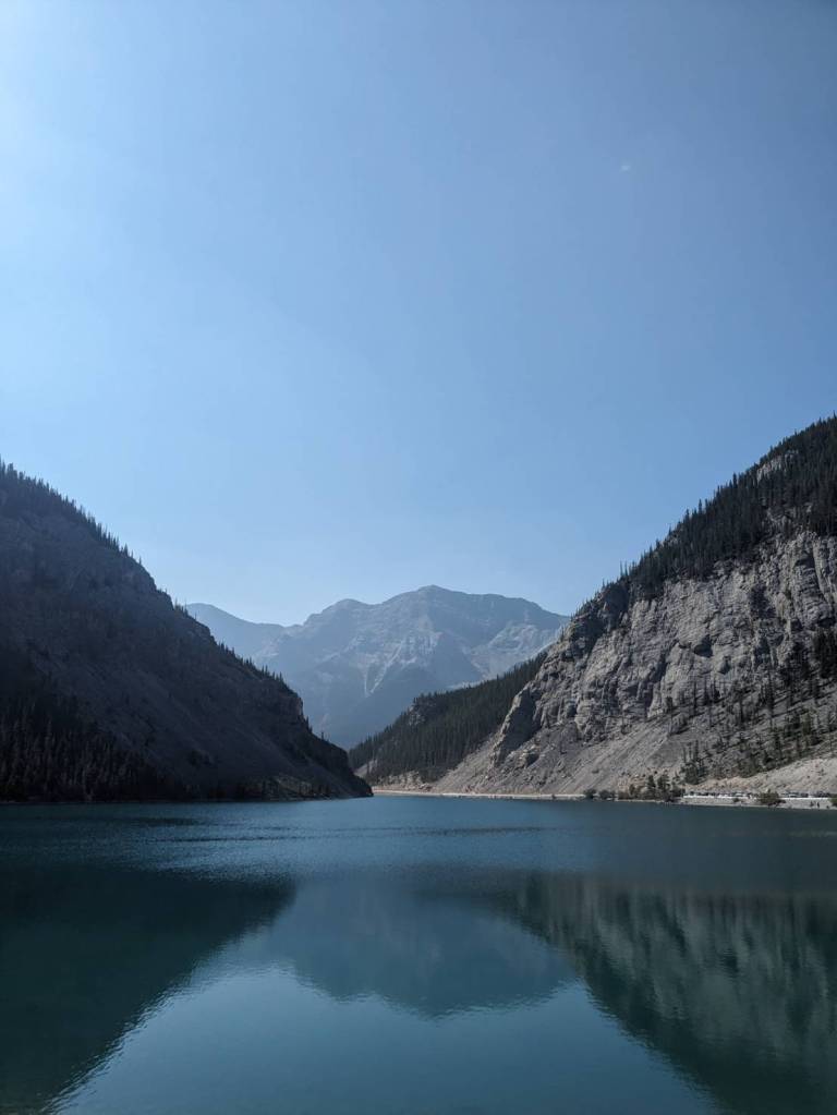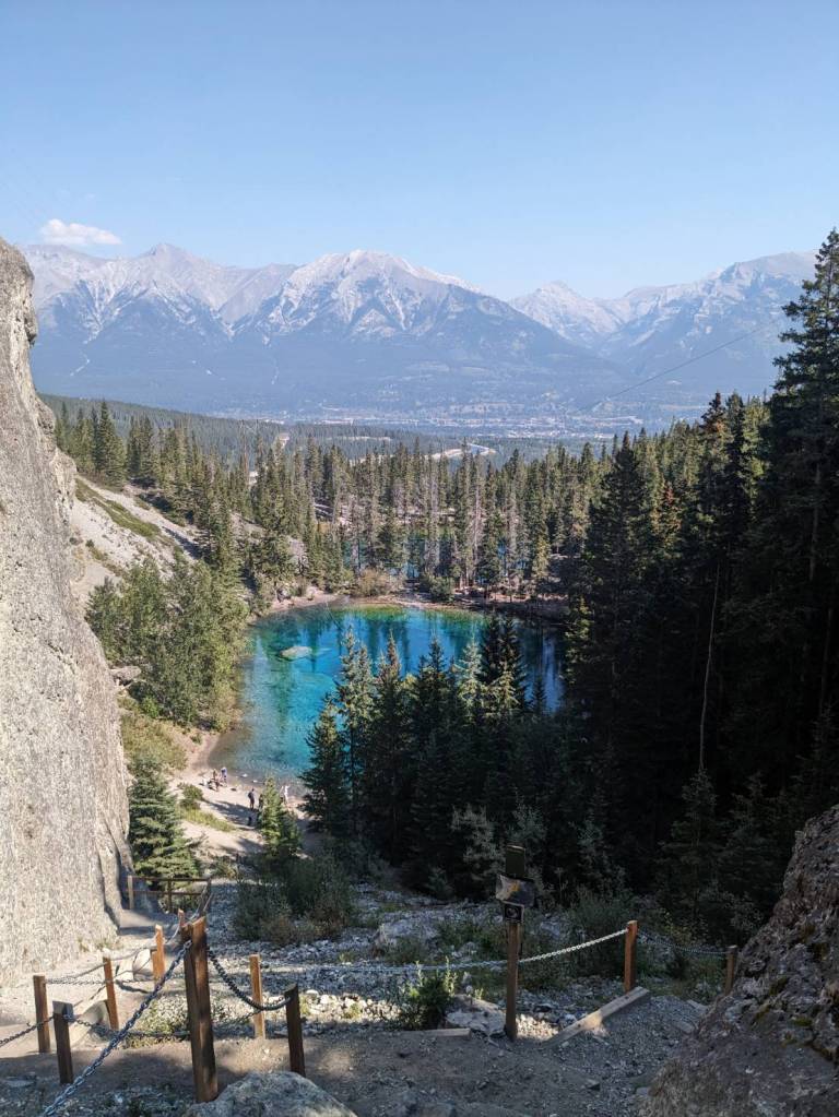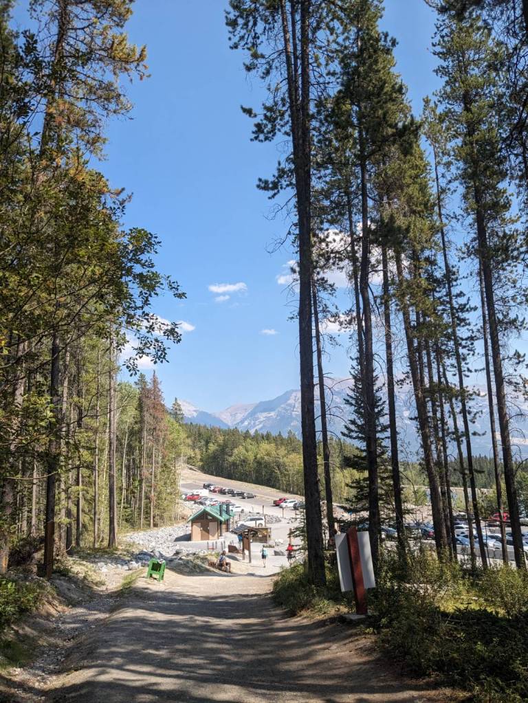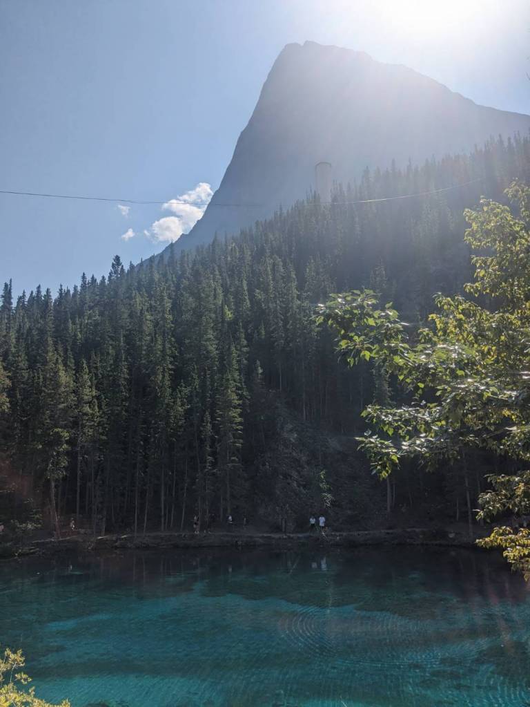 走了半小時,終於快到終點了,也能從樹林縫隙看到有如藍寶石的Rundle Forebay。