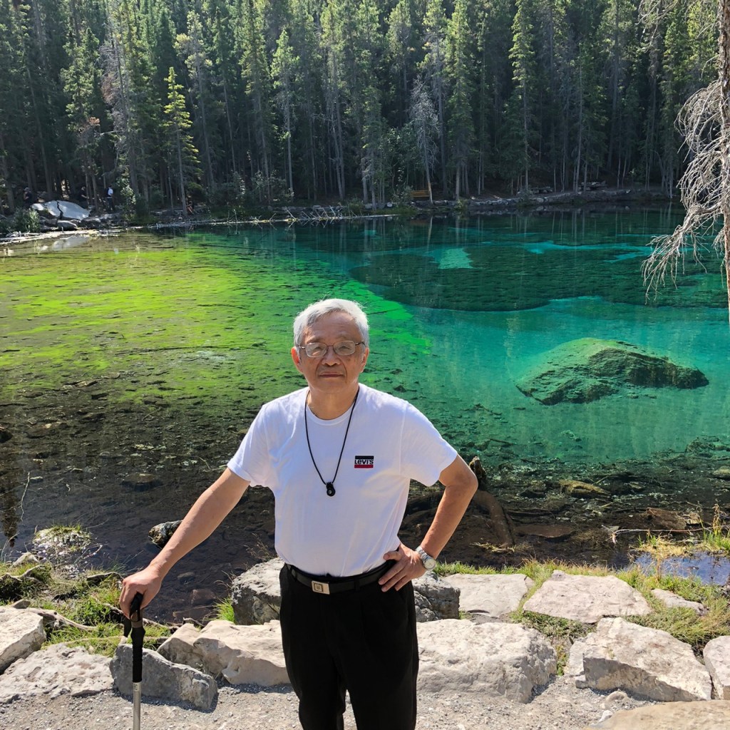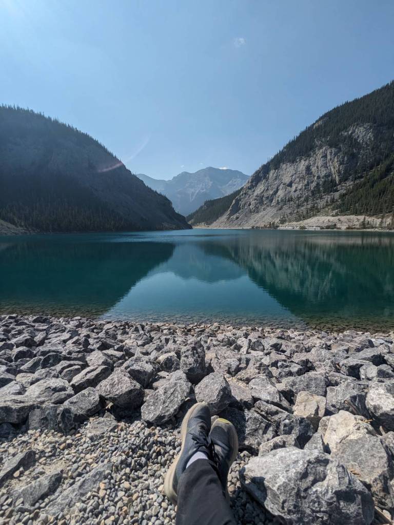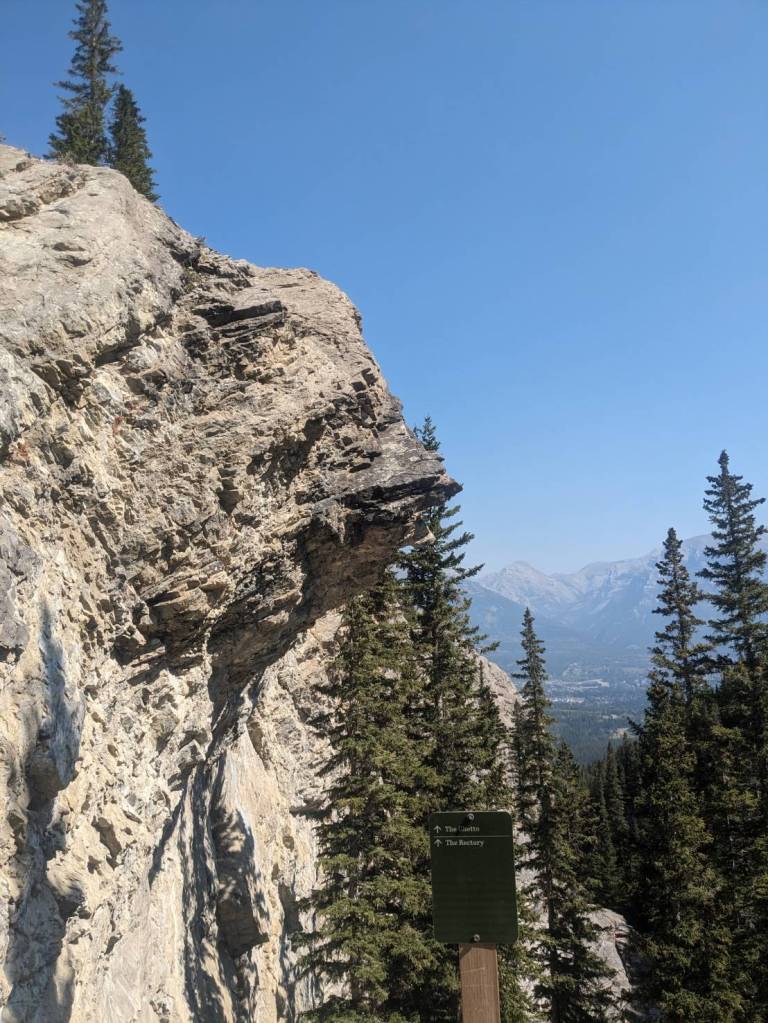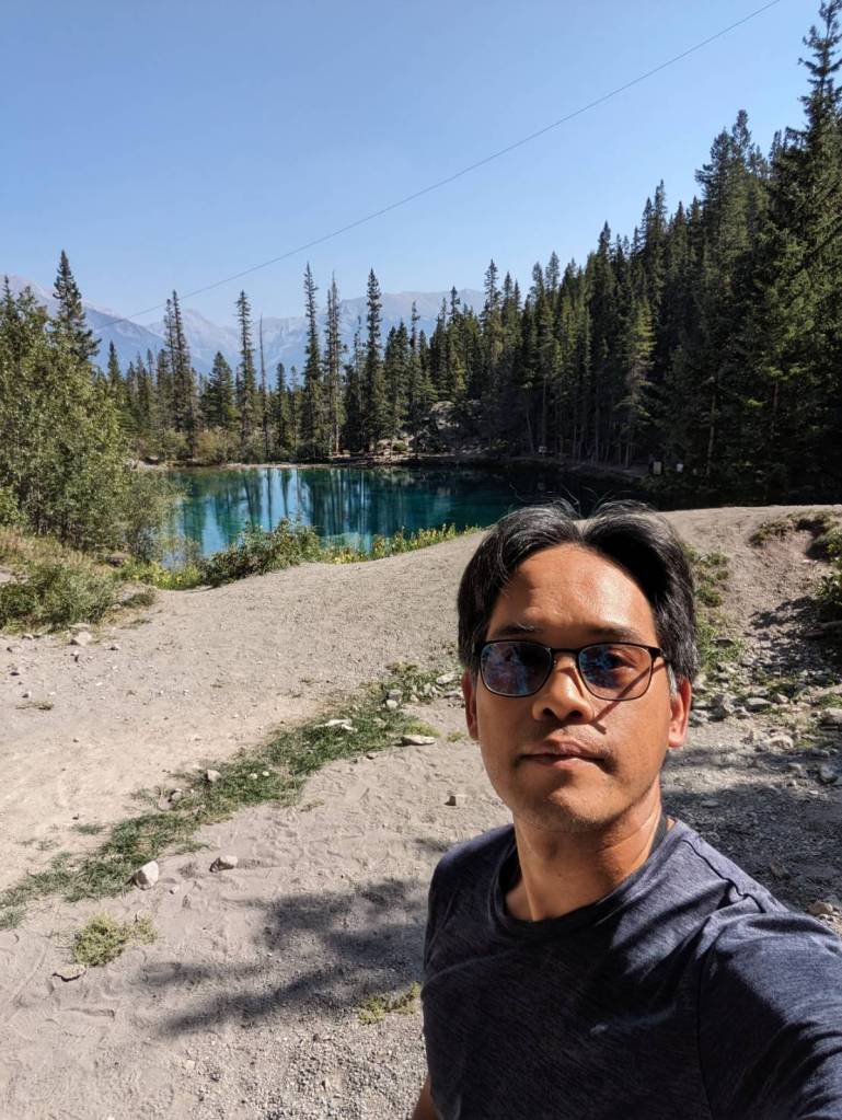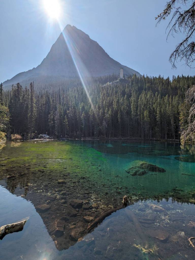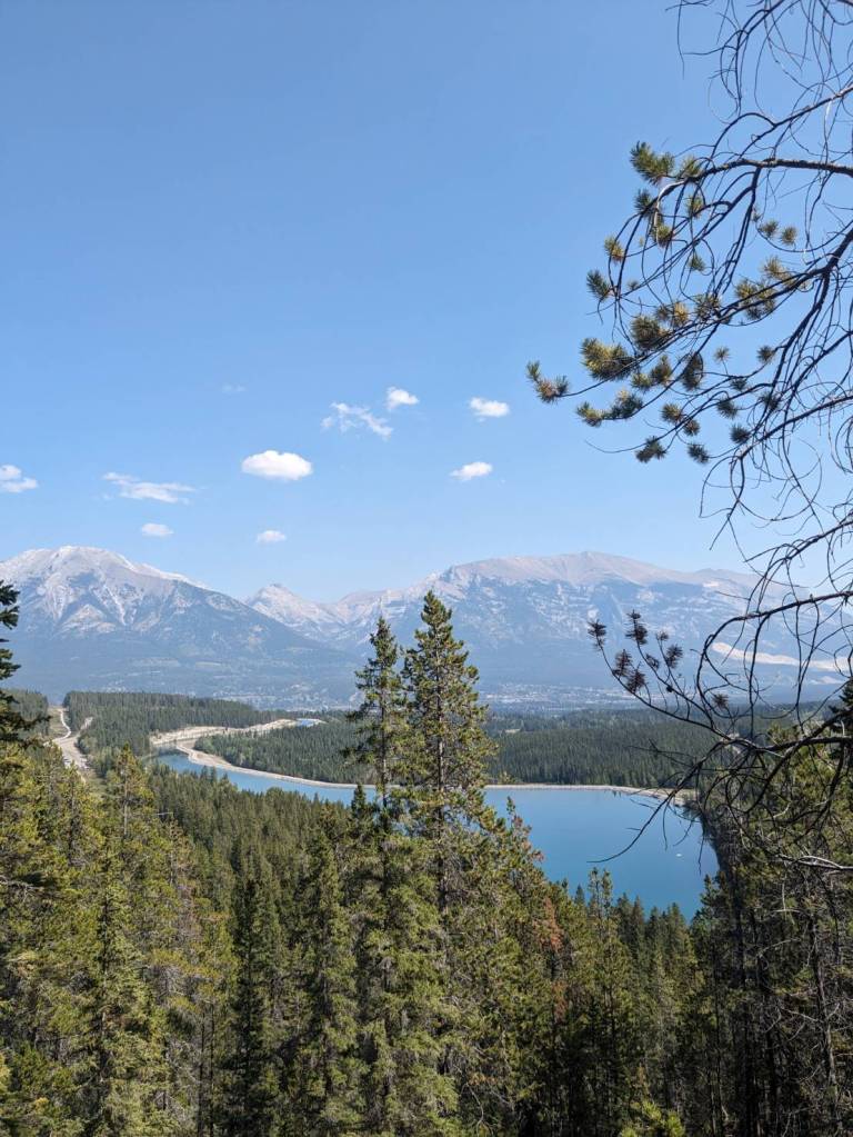 走了半小時,終於快到終點了,也能從樹林縫隙看到有如藍寶石的Rundle Forebay。