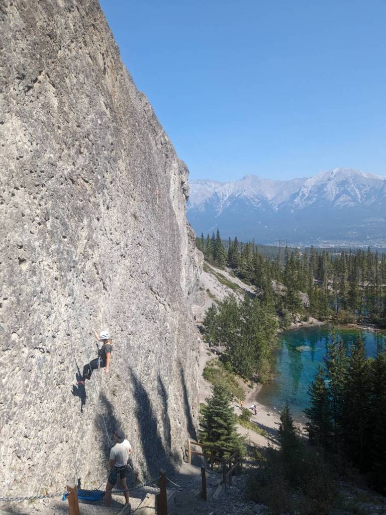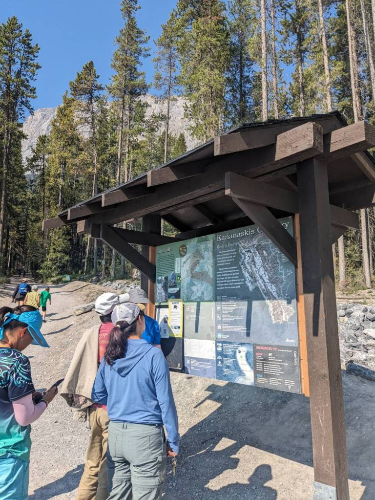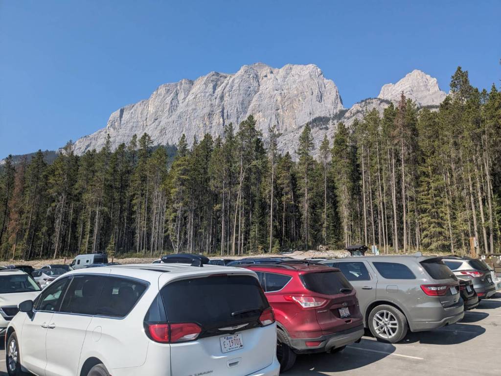 越過「弓河」(Bow River)不久, Mount Rundle山腳下的美麗水庫湖–Rundle Forebay出現在我們眼前,湖沿可停車的地方都已經停滿,湖面可見到滑槳板的遊客,很快地我們就抵達「葛拉西湖小徑」停車場(Grassi Lakes Trail Head)了,整個車程約15分鐘。